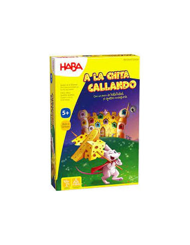 El ratón Mauricio entra a hurtadillas en el Castillo del Queso para robarle un pedazo de queso al rey. Pero ¡ojo! ¡No deben sonar para nada las campanas de alarma! A la Chita Callando es un juego de mesa para niños de Haba en donde los jugadores tendrán que tratar de robar un pedazo de queso al rey, con mucho cuidado para no hacer ruido. Con todo el cuidado del mundo tratáis de introducir vuestros bastoncitos por los agujeros del Castillo del Queso sin rozar éste. ¡Los compañeros de juego tienen que permanecer en un silencio absoluto! Pues al menor ruido saltan las campanas de alarma y se termina ese turno.