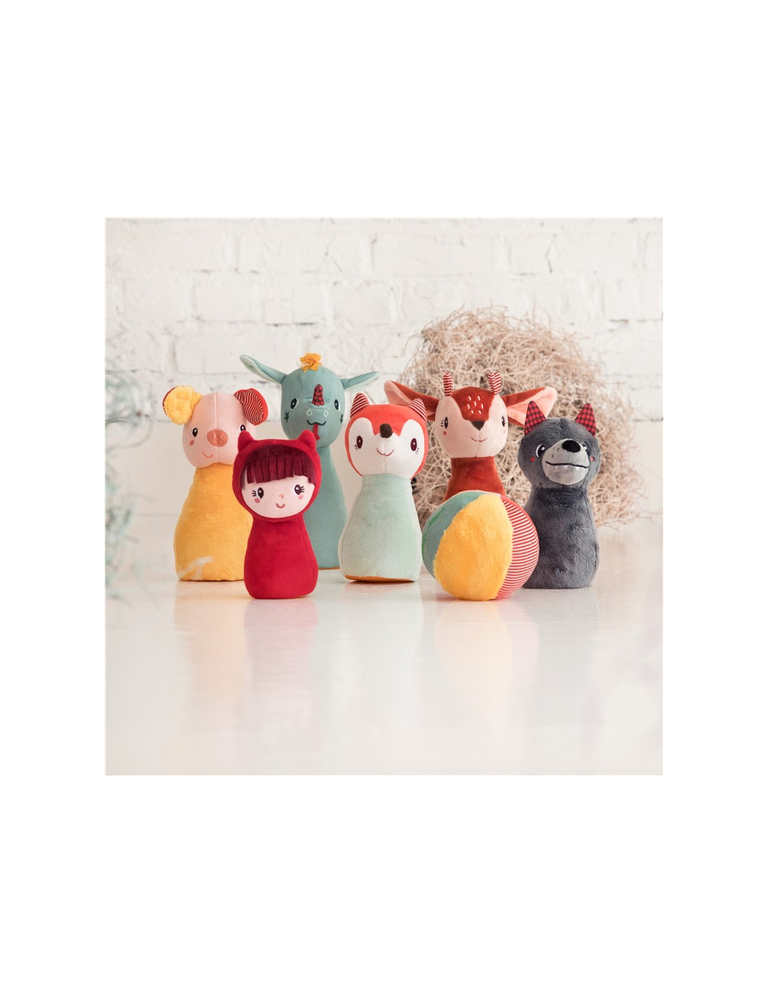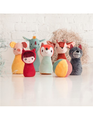 ¿Quién puede derribar a esta alegre pandilla de amigos del bosque de un solo lanzamiento? Este colorido juego de bolos consta de 6 bolos suaves y una pelota sonajero suave de tela. Para jugar en interiores sin dañar nada y convertirse en una futura estrella del bowling.