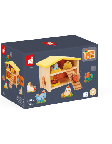 Un juguete de madera compuesto por un bonito gallinero y 9 accesorios para jugar e inventar bonitas historias. Los niños se divertirán colocando las 6 gallinas, el gallo, el nido con huevos para incubar y el nido con un pollito, en este magnífico escenario de juego, gracias a las diferentes entradas: una puerta corredera, una puerta con bisagra elástica, un gallinero. agujero en forma y una escalera extraíble. Un juguete de madera de alta calidad, ideal para desarrollar la destreza y descubrir el mundo de la granja mientras te diviertes.