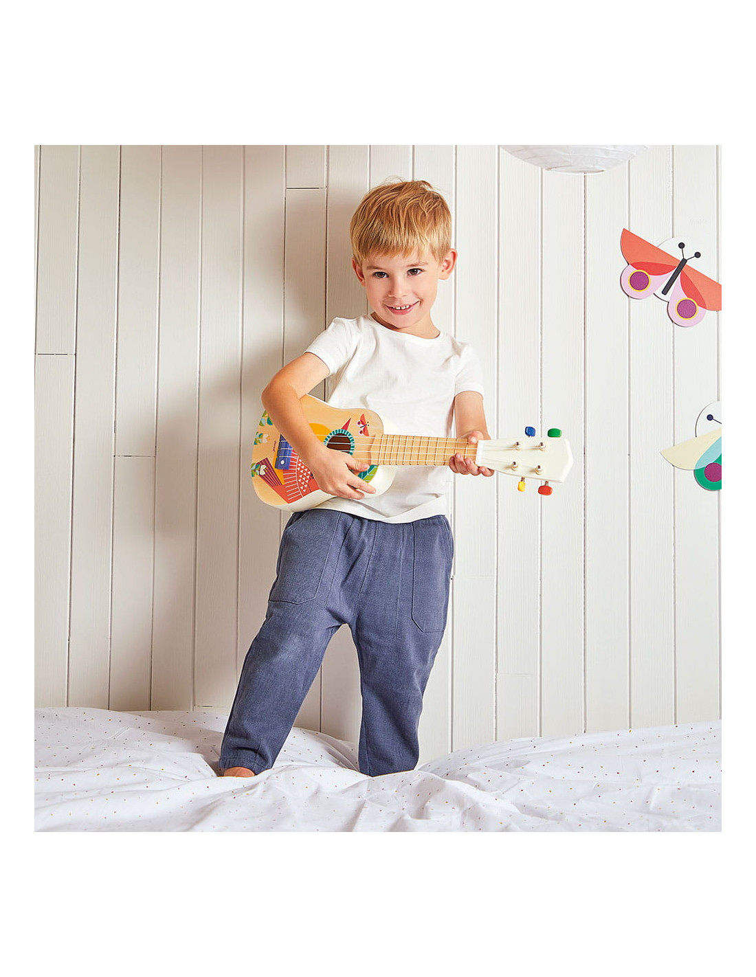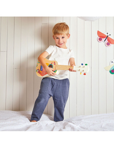 El ukelele de madera de la serie Gioia de la marca francesa JANOD es un primer juguete musical ideal para un niño que ayuda a desarrollar el oído , el sentido del ritmo y las habilidades musicales . También apoya el desarrollo de la imaginación , la concentración , la perseverancia y la coordinación motora . El ukelele tiene cuatro cuerdas, botones para ajustar su tensión, un tamaño práctico y colores alegres : en el cuerpo están pintados hojas tropicales, el sol y un loro naranja. El juguete fue diseñado en Francia. Está embalado en una estética caja de cartón. Perfecto para regalo.