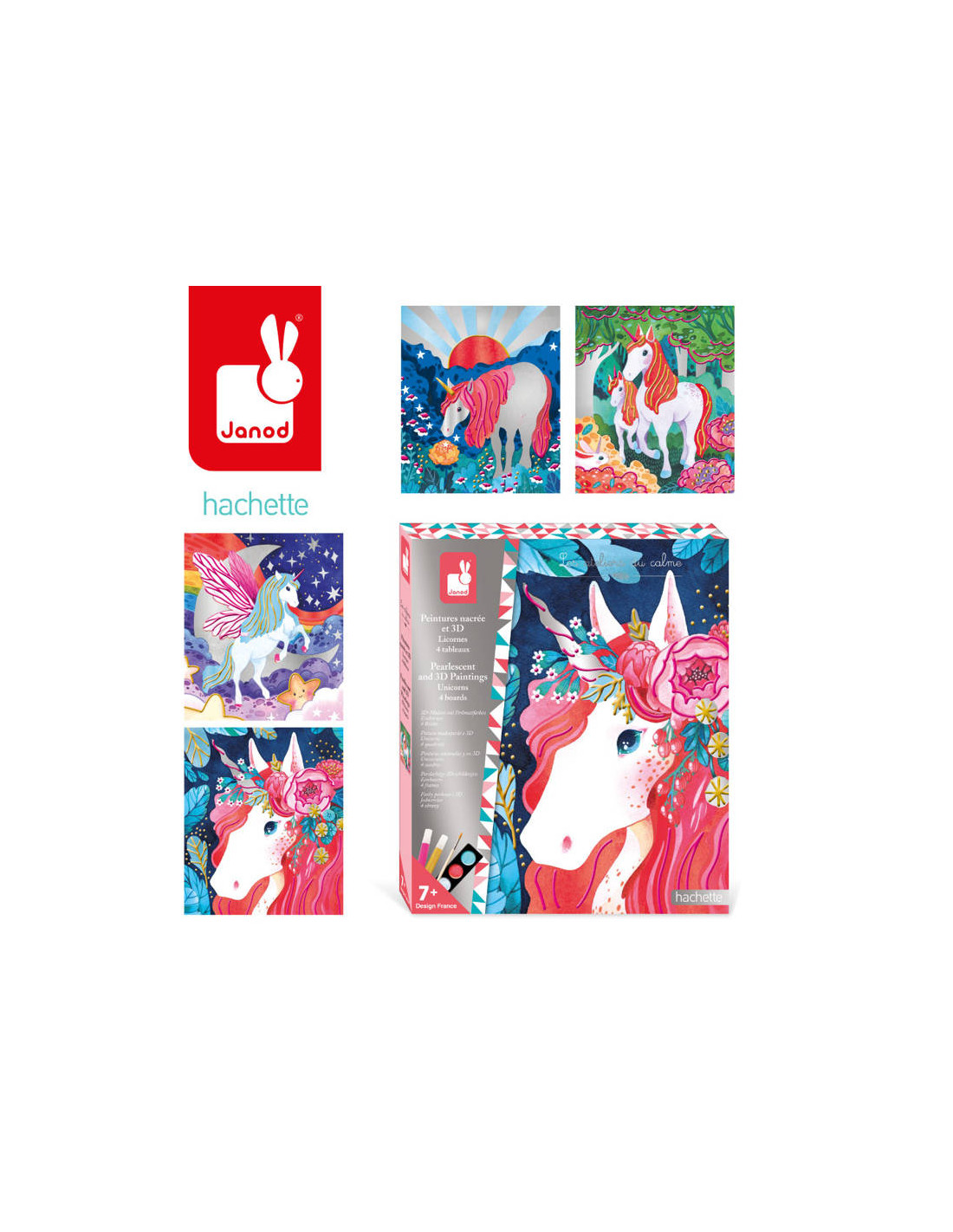 Un creativo set de pintura con pinturas nacaradas y Unicornios 3D e Se compone de 4 tableros con escenas coloridas de cuentos de hadas, cuyos héroes son unicornios excepcionalmente encantadores. Las pinturas nacaradas incluidas en el set servirán para decorar las ilustraciones, hay 3 colores de pinturas que dan un brillo satinado y dos colores de pinturas para pintura 3D.