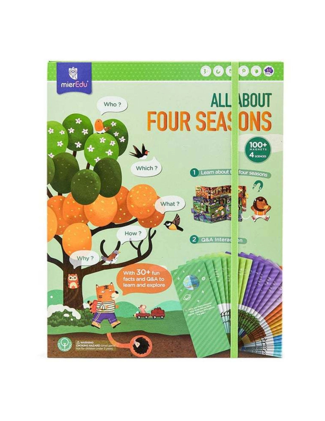 Verano Otoño Invierno Primavera. Aprende sobre las cuatro estaciones con este rompecabezas magnético. Con cuatro juegos de temporada diferentes y una amplia variedad de imanes coloridos y divertidos, este kit desplegable permite que los niños jueguen y sean creativos. ¡El único límite es su imaginación!