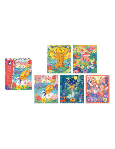 El set creativo Pintura mosaico con botones El jardín secreto de la marca francesa JANOD contiene 5 tableros con imágenes coloridas que representan escenas de bosques de cuento de hadas con hadas, elfos e insectos. A estas ilustraciones, puedes pegar las pequeñas decoraciones de arcilla polimérica incluidas en el set (¡hasta 870 piezas!) en 10 formas diferentes en los lugares designados, que incluyen: hojas, flores, pétalos, etc. El juego incluye unas prácticas pinzas para atrapar y mover elementos pequeños. Pegar pegatinas significa para el niño largas horas de diversión entretenida y al mismo tiempo reconfortante y tranquilizadora, y las imágenes terminadas se convertirán en un maravilloso elemento decorativo de la habitación infantil. El decorado fue diseñado en Francia en colaboración con el grupo editorial y de medios francés Hachette y la artista Cinzia Sileo. Está empaquetado en una elegante caja de cartón. Perfecto para regalo.
