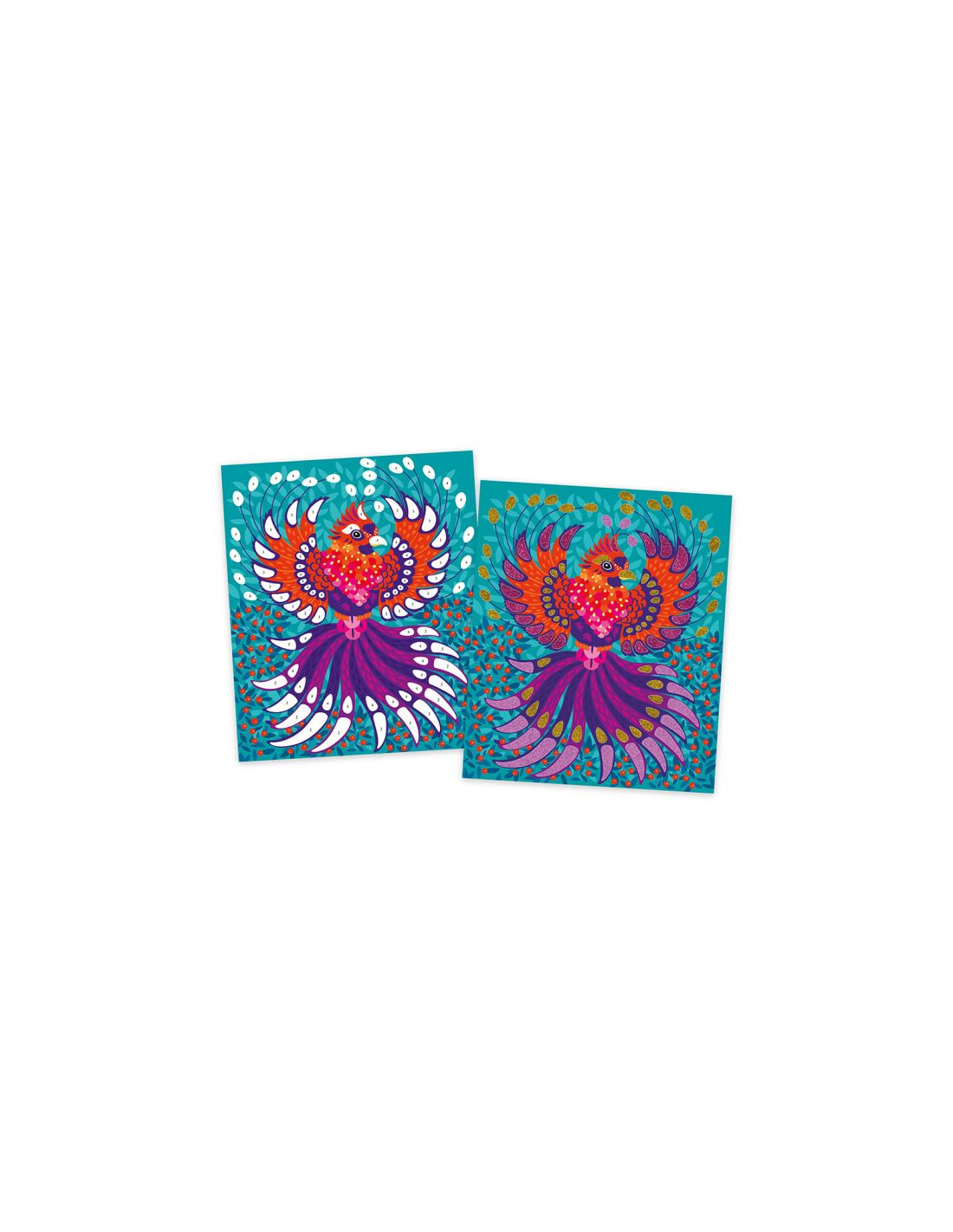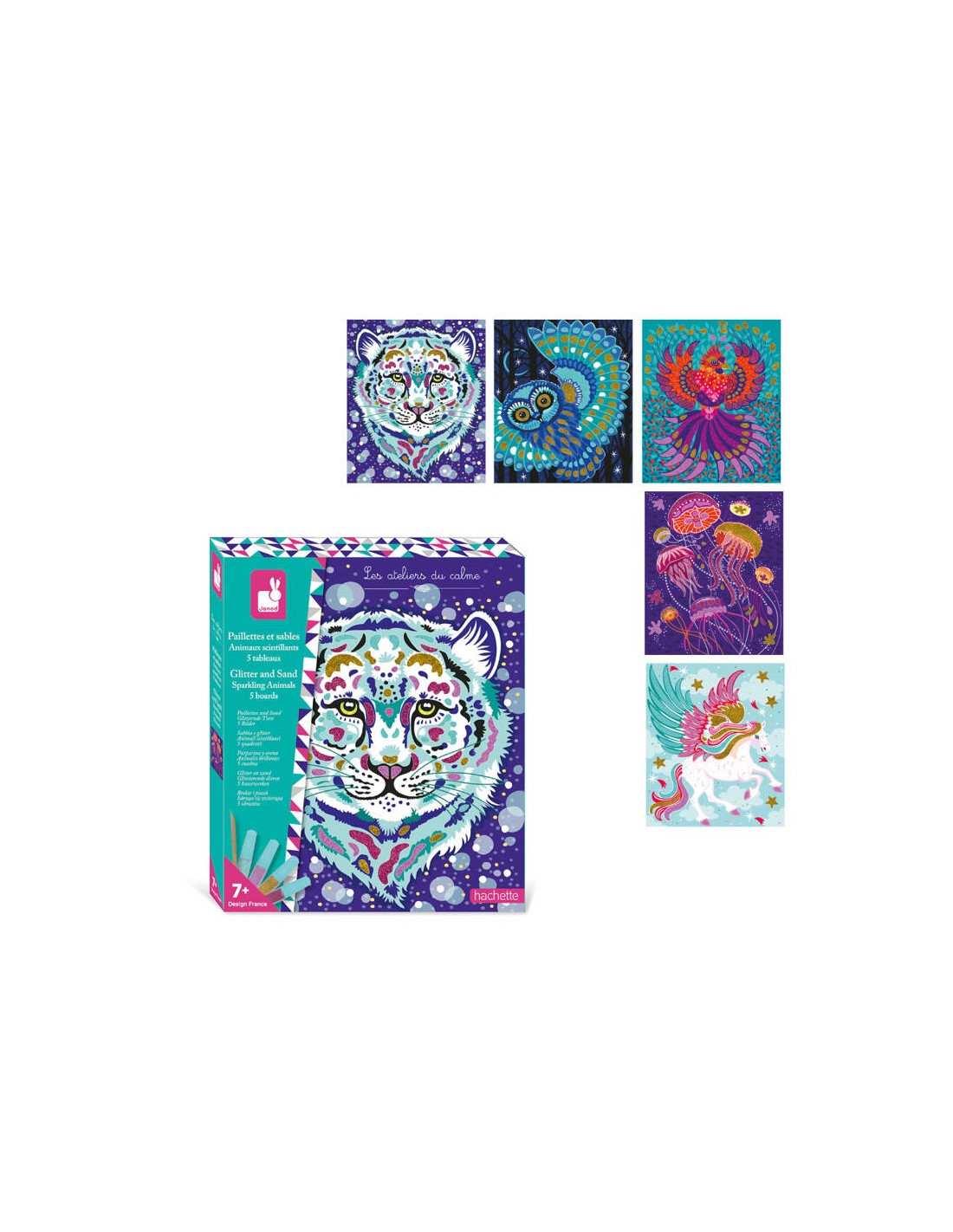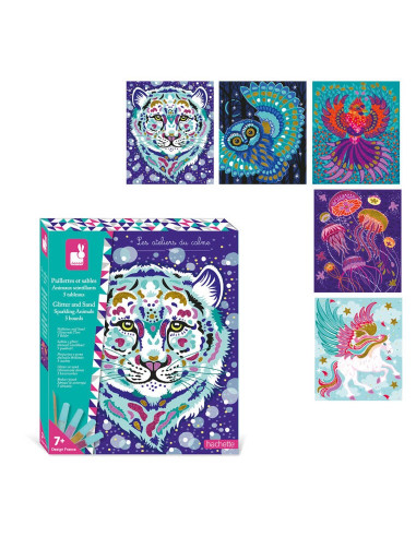 El set creativo Glitter and Sand Animals de la marca francesa JANOD contiene 5 tableros ilustrados con un gato montés, un unicornio, una medusa, un búho y un loro. Las ilustraciones deben espolvorearse con la brillantina incluida (dorada o rosa) y arena (rosa o azul) en tubos en los lugares designados. La brillantina y la arena se adhieren a las imágenes, dejando en ellas una estructura de grano fino. El set también incluye un palito de madera para destapar antes las superficies a decorar. Estas decoraciones brindan al niño horas de diversión atractiva y al mismo tiempo relajante y relajante, y las imágenes ya hechas se convertirán en una maravillosa decoración para la habitación de un niño o en un regalo para un ser querido.