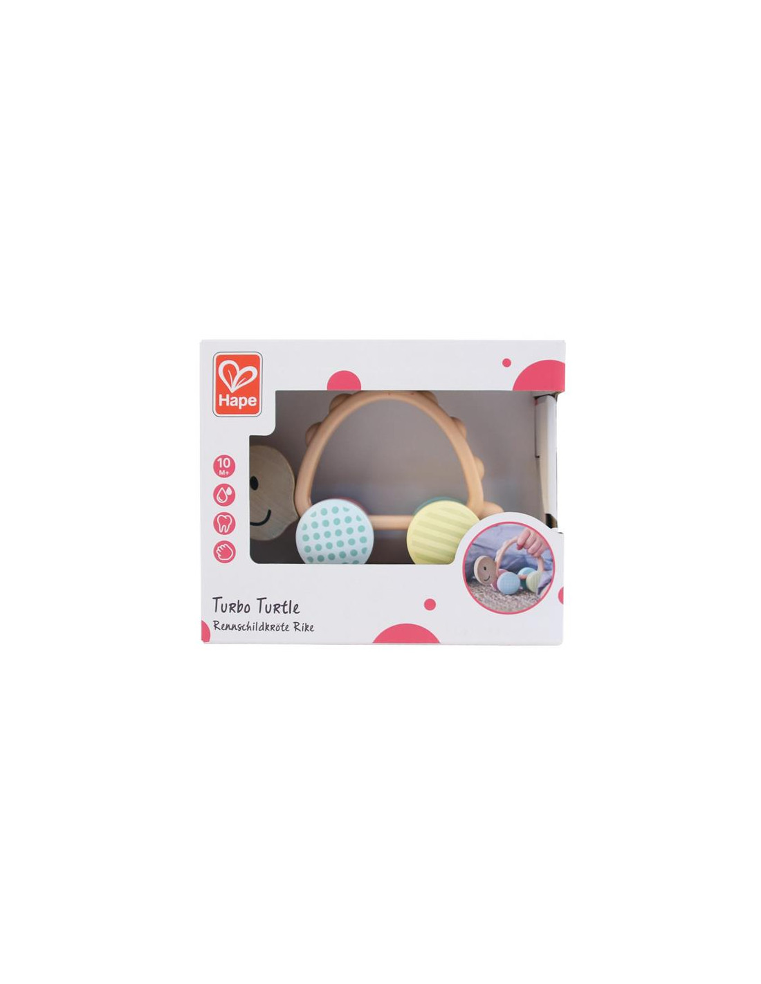 ¡Lleva a tu linda tortuga turbo a dar una vuelta por la sala de estar! ¡Con ruedas brillantes, coloridas y estampadas y un asa de empujar / tirar / transportar hecha de silicona que es 100% segura de masticar!