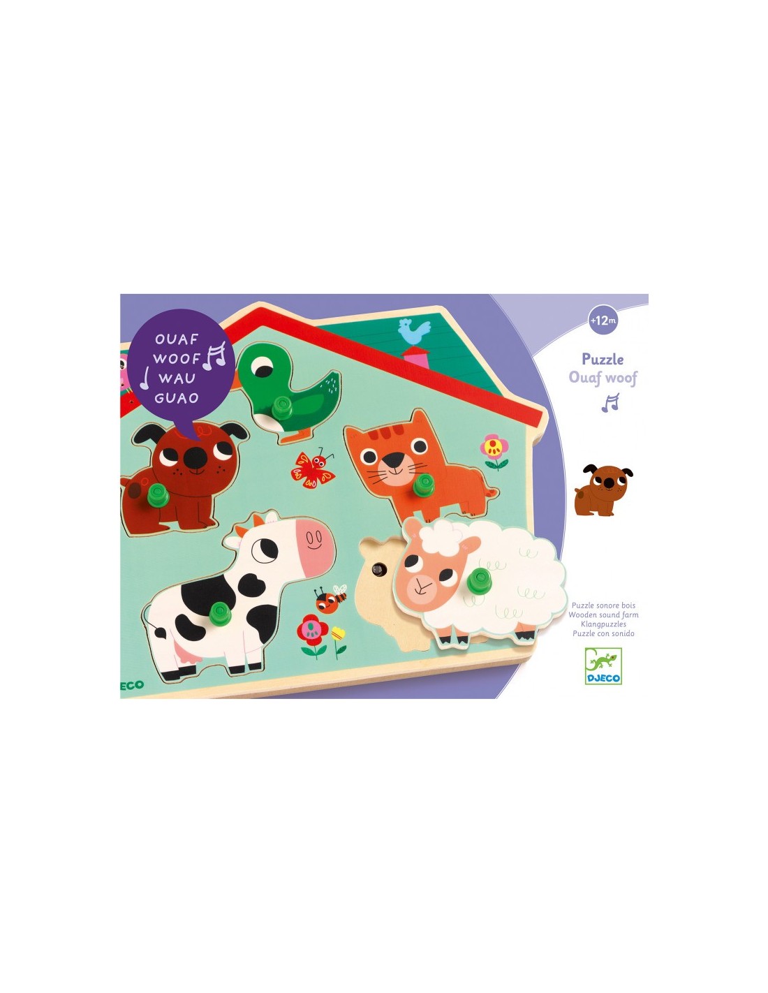 -Ouaf Woof es un puzle de madera encajable y con sonido sobre el tema de la granja.