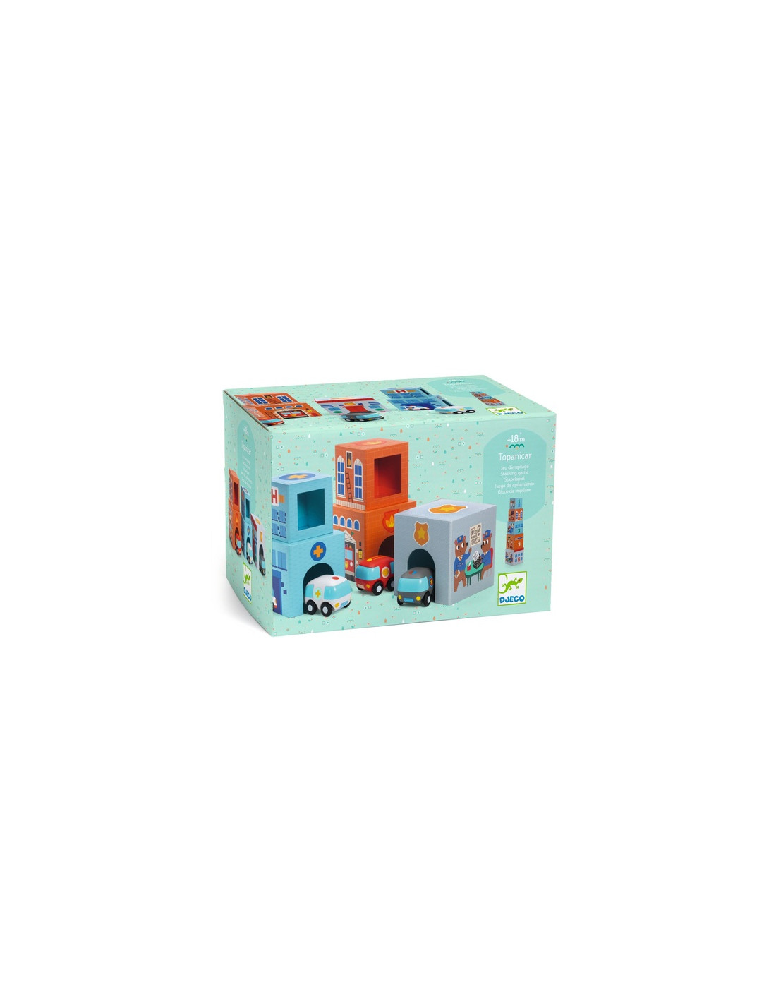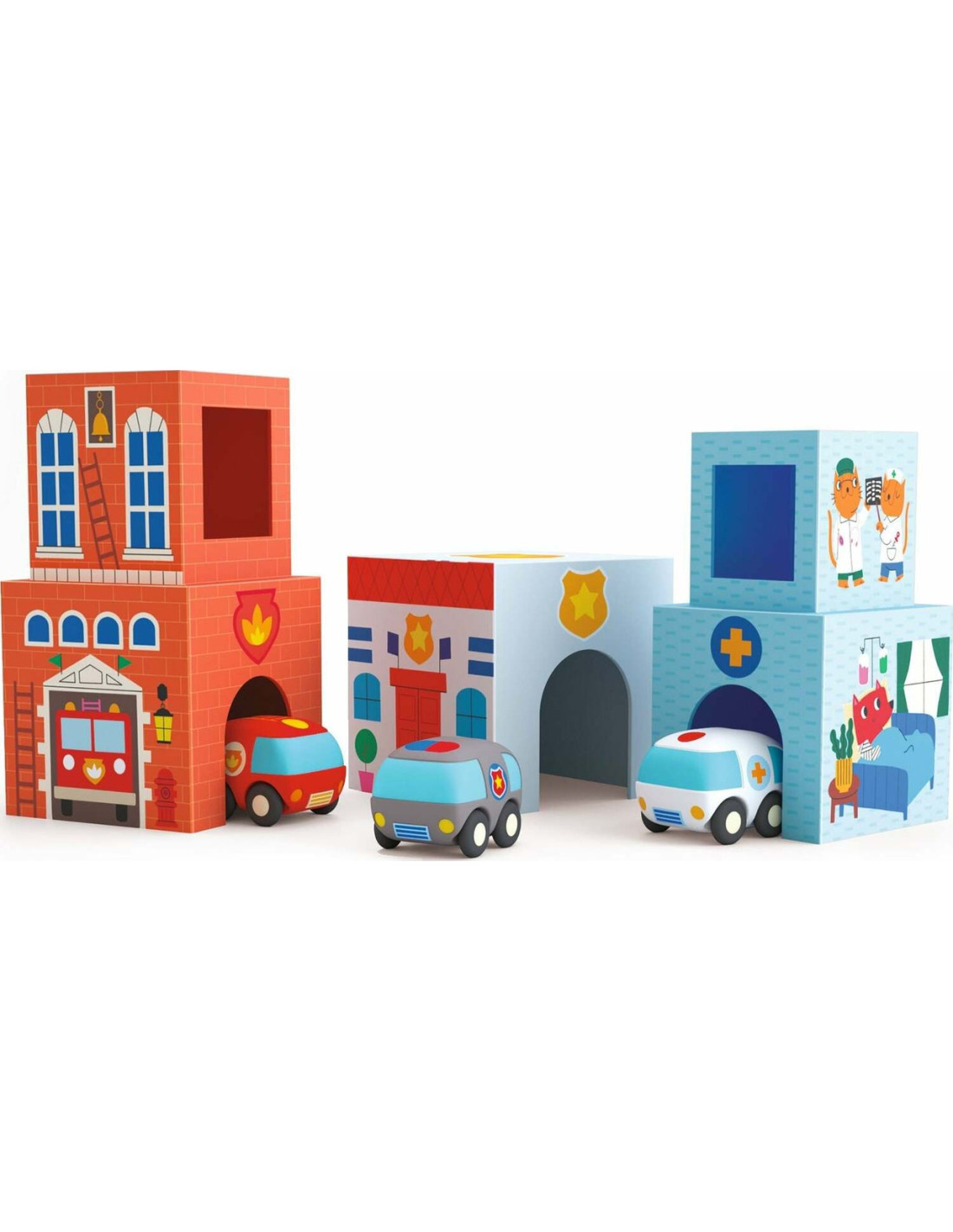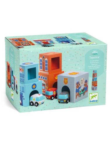 Topanicar costa de 5 cubos de cartón apilables ilustrados con motivos relacionados los bomberos, las ambulancias y la policía y 3 originales vehículos (bomberos, ambulancia y policía) para inventar divertidas historias. Los cubos tienen una apertura lateral que simula una puerta para poder meter a los coches en su interior.
