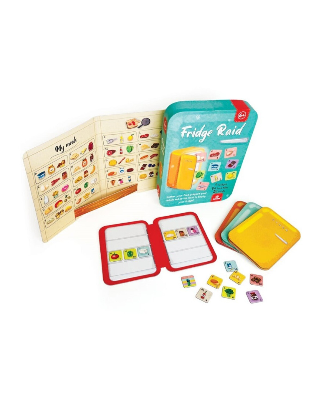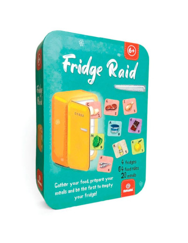 Fridge Raid es un emocionante juego para 2 a 4 jugadores que desarrolla la observación, el pensamiento estratégico… ¡y el apetito! ¡Prepara tus comidas y vacía tu nevera! Sigue las reglas con combinaciones, secuencias y objetos coincidentes y deshazte de tus fichas magnéticas colocándolas en la mesa de la manera correcta. Agrega elementos a las combinaciones de tus oponentes.