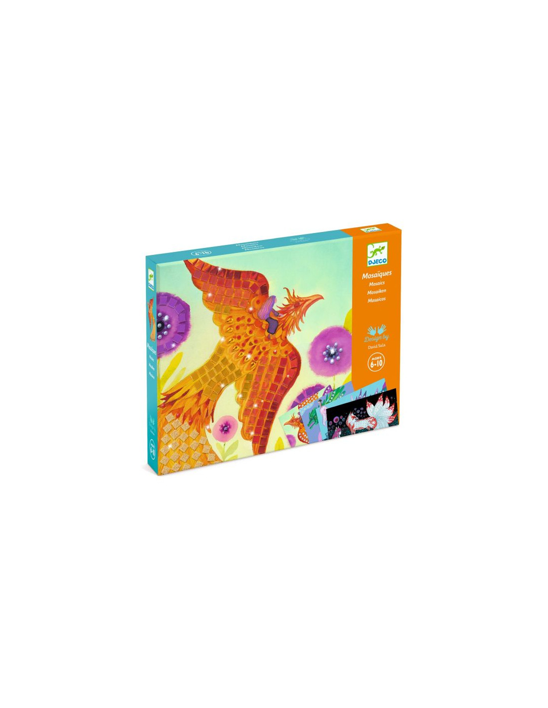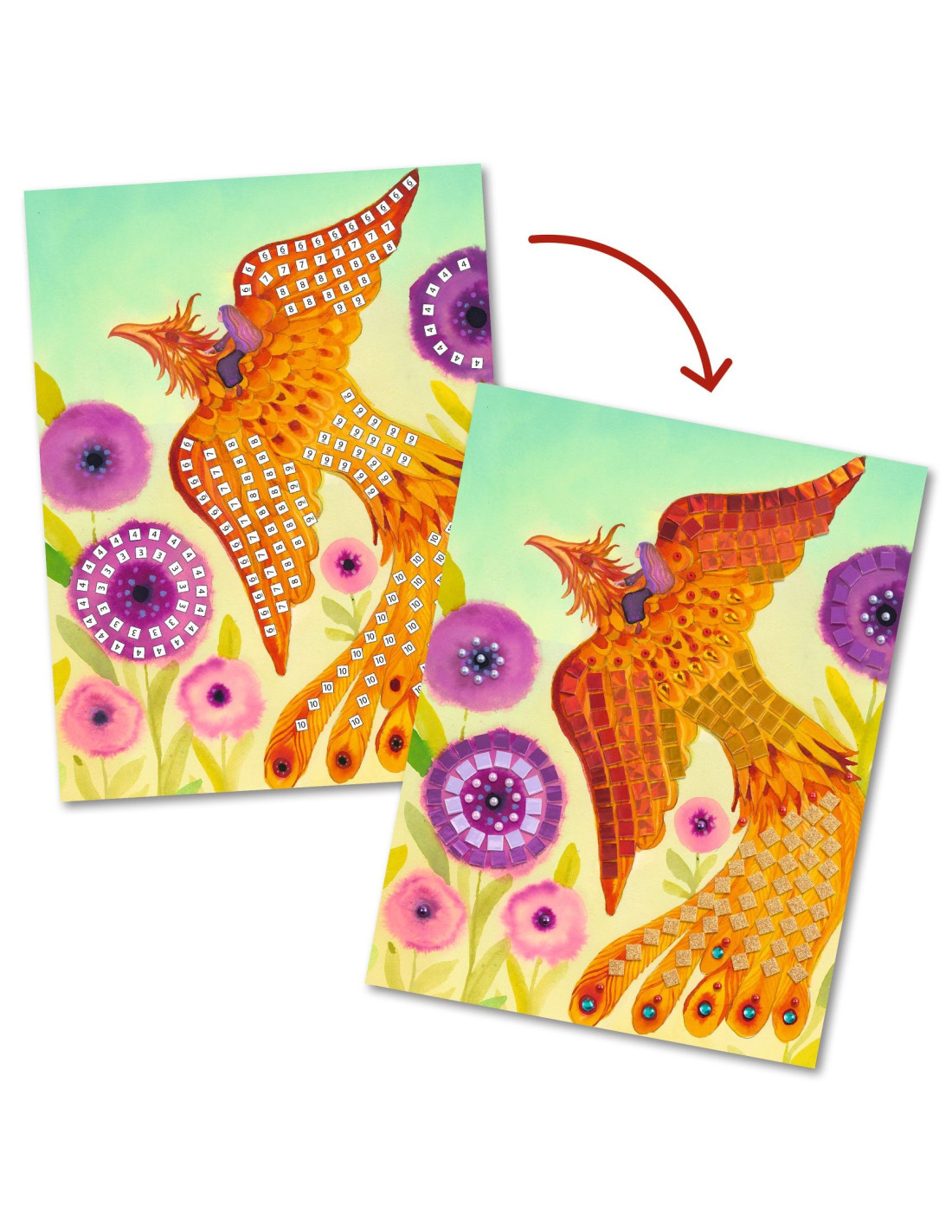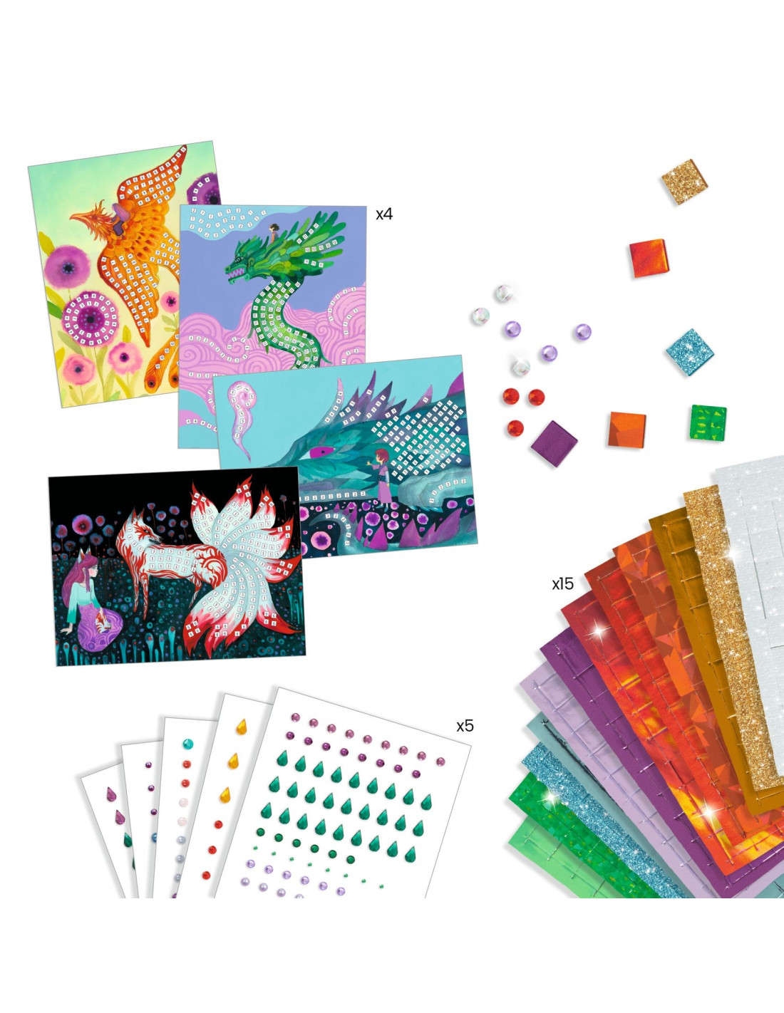 Un conjunto de mosaicos para principiantes. Hay 4 cuadros para completar con plumas o pelaje, escamas de esmeralda o de hielo, los niños y niñas pueden completar los retratos de estas 4 criaturas legendarias utilizando mosaicos adhesivos con purpurina o metalizados.