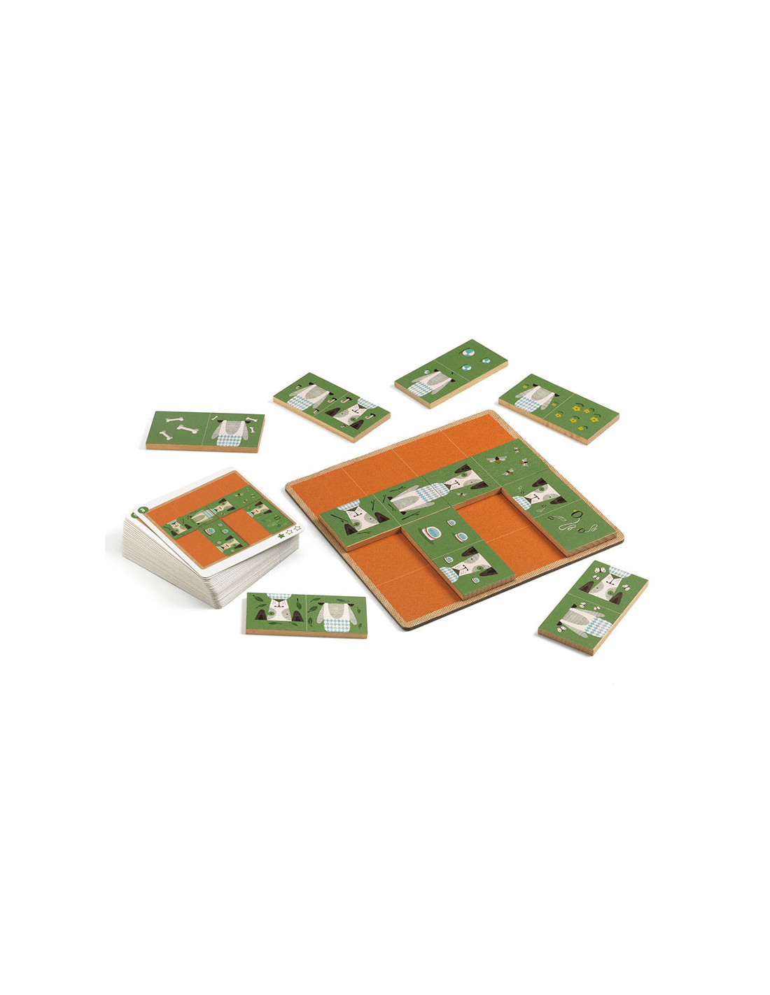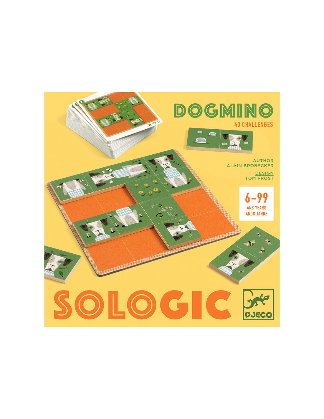 Dogmino es un juego de lógica para un jugador de la colección SOLOGIC de Djeco. Al igual que en juego del dominó, reconstruye los perros y crea un cuadrado perfecto sobre le tablero de juego.