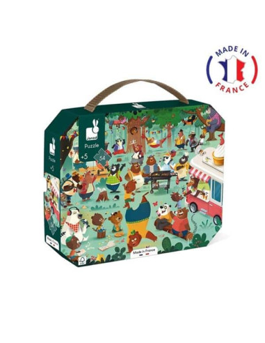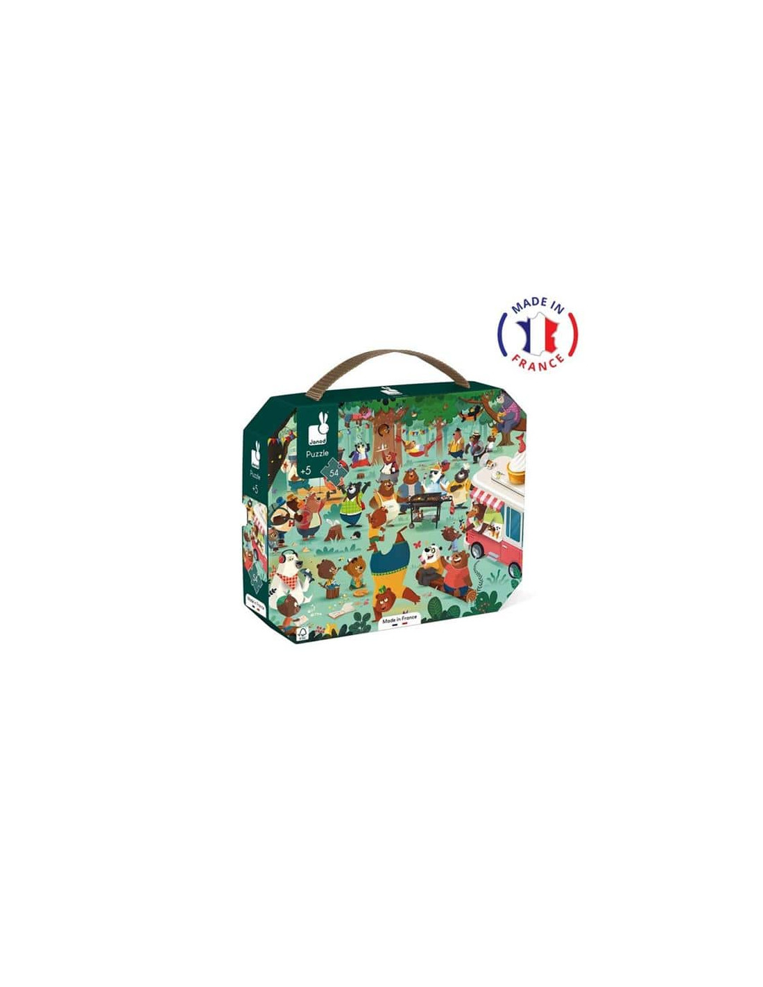 Participa en esta gran reunión familiar en medio del bosque a la vez que desarrollas tu memoria y tu habilidad con este bonito puzle de cartón de 54 piezas. Este puzle se transporta fácilmente gracias a su bonito maletín y a su asa de tela. Contiene un póster que sirve como modelo para los principiantes. Los más avezados podrán a continuación realizar el puzle con total autonomía. Fabricado en Francia. Cartón con certificación FSC y tintas vegetales.