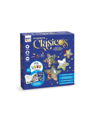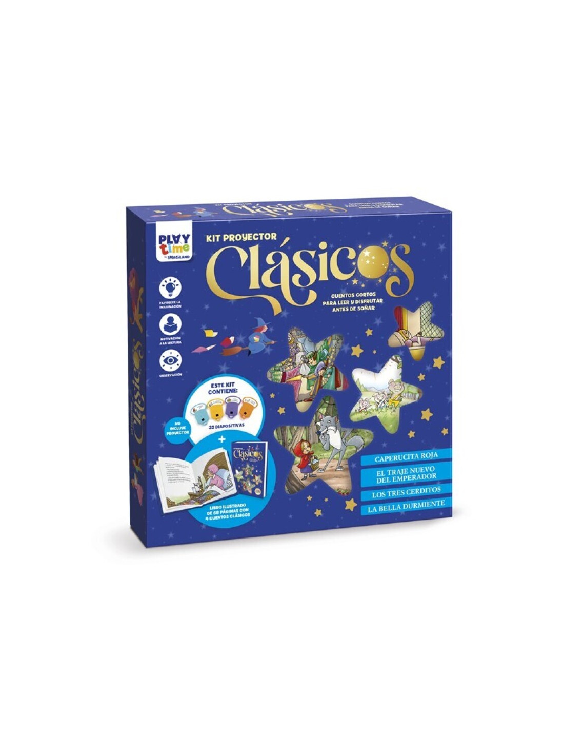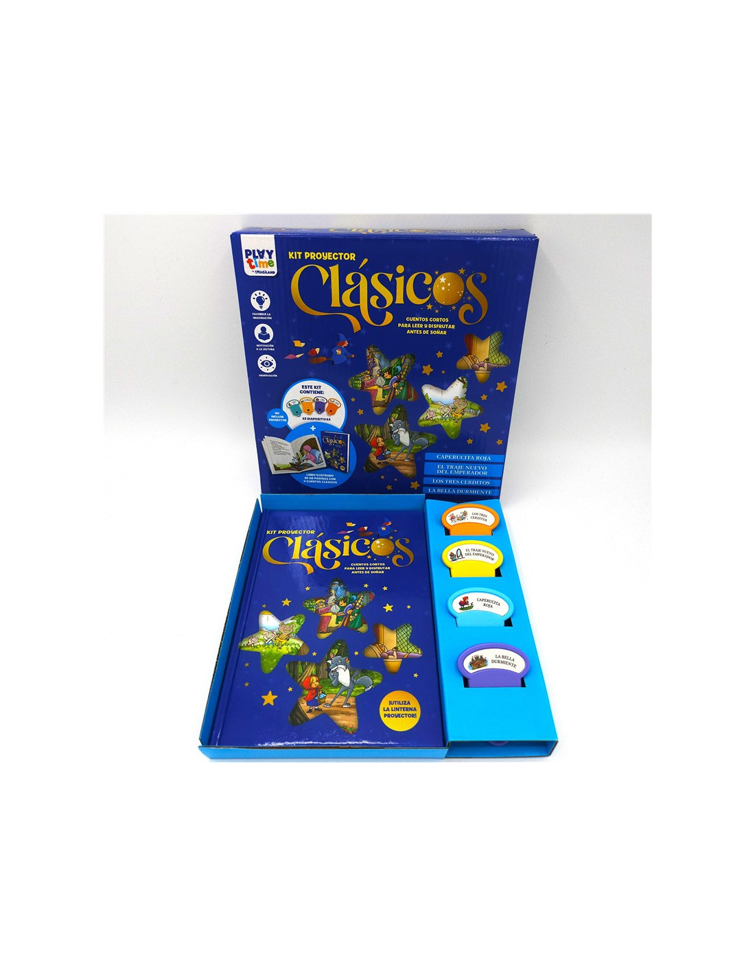 Pack con un libro ilustrado con 4 cuentos clásicos: CAPERUCITA ROJA, EL TRAJE NUEVO DEL EMPERADOR, LOS TRES CERDITOS y LA BELLA DURMIENTE , un proyector, 4 discos con 32 diapositivas para proyectar, Compatible para el proyector Cuentos clásicos