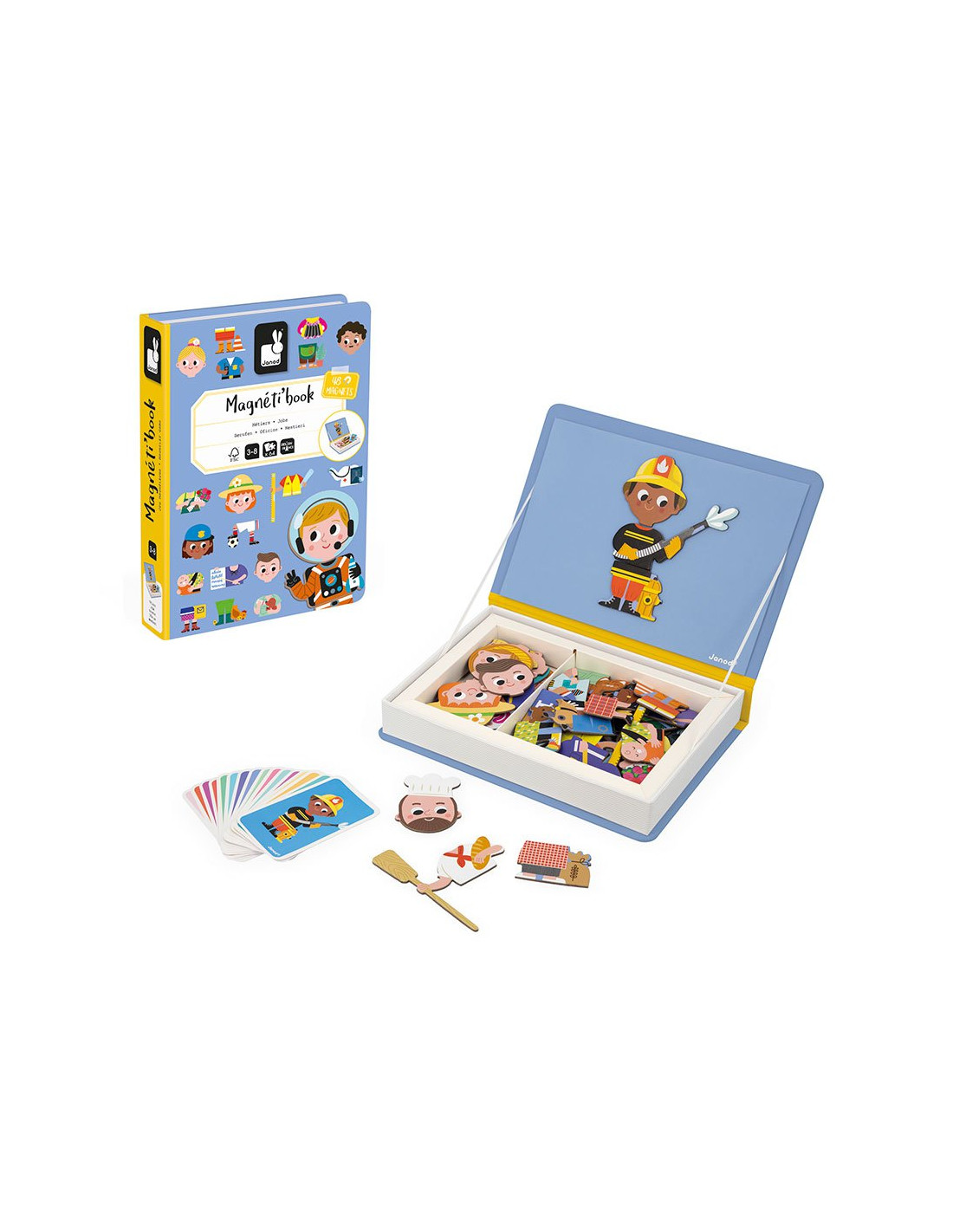 Cuando sea mayor, seré... ¡Abre tu Magnéti’book para descubrir las profesiones! Con este bonito y colorido juguete magnético, su hijo descubrirá 16 profesiones, ¡y tendrá la posibilidad de inventar muchas más! Está compuesto por un soporte magnético, 48 imanes y 16 tarjetas que representan profesiones conocidas. Tanto los más pequeños como los mayores se divertirán reproduciendo los modelos y mezclándolos para imaginar combinaciones de profesiones, cada una más alocada que la otra.