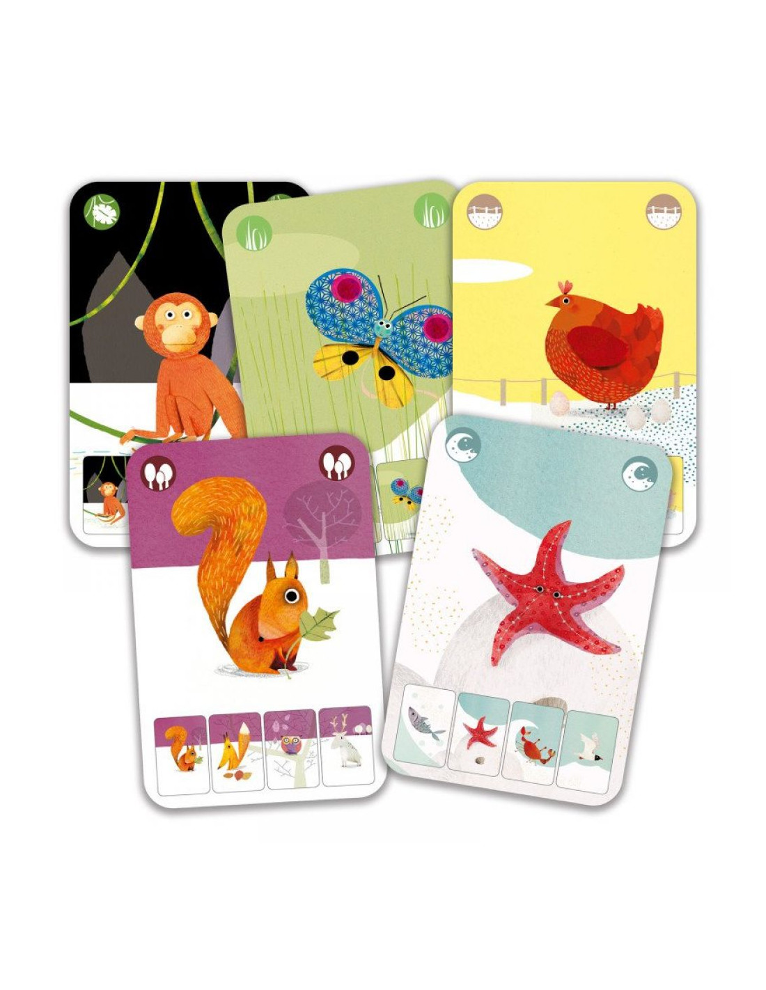 Un juego de 7 minifamilias. Los jugadores deben reunir las familias de 4 animales que viven en el mismo entorno natural. ¡El que tenga más familias gana! -Un juego de 7 familias de 4 animales al alcance de los más pequeños. -Reglas del juego inspiradas en un juego de cartas clásico. -Fantásticas ilustraciones para dar rienda suelta a la imaginación. -Una caja compacta, que se puede llevar a todas partes. -Cartas de calidad y resistentes.