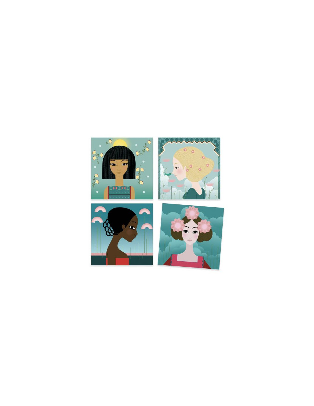 Una caja de sellos original que permite al niño componer motivos para decorar los vestidos y el cabello de estas princesas del mundo. El niño asocia los motivos y los posiciona con precisión gracias a los sellos transparentes que le permiten ver su creación en todo momento. A medida que el trabajo avanza, las princesas quedan decoradas con adornos sutiles y refinados.