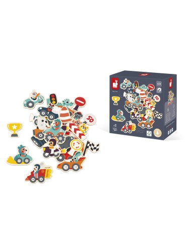 ¡A divertirse! ¡Abrid paso a los coches de carreras! Imaginemos locas carreras con los diferentes vehículos. ¿Ha habido un choque? Que no cunda el pánico, la grúa está lista para intervenir. Nos vemos en la línea de meta para la entrega del trofeo. Este kit está compuesto por 24 imanes de madera que se pueden colocar en pizarras magnéticas o cualquier otra superficie magnética. De esta forma, su hijo podrá desarrollar su imaginación y su destreza mientras se divierte.