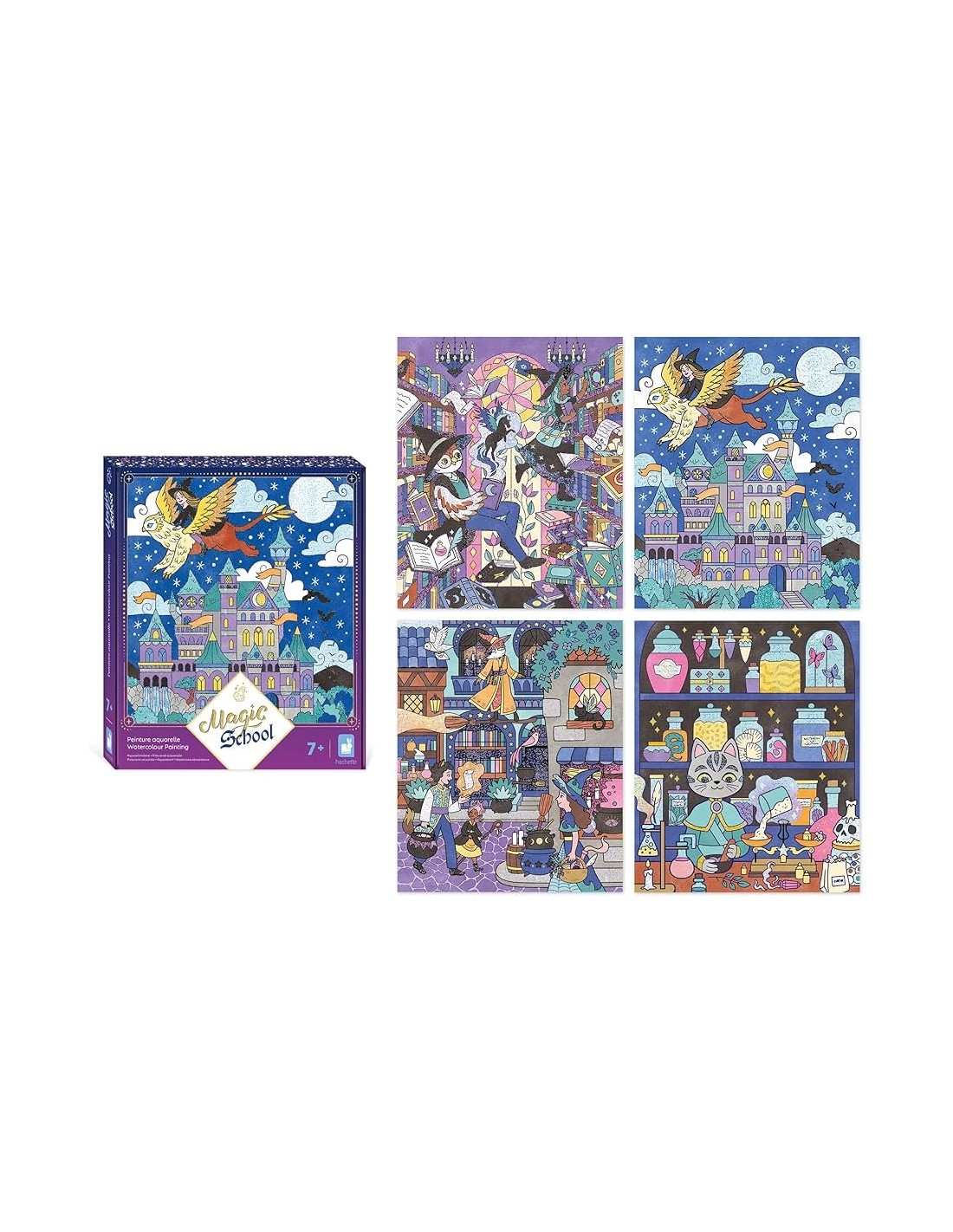 Conviértete en un verdadero pintor! Esta caja creativa te permite crear 4 cuadros con líneas brillantes, áreas ya coloreadas con purpurina y áreas para pintar con una paleta de pintura de acuarela y 1 pincel con depósito de agua sobre el tema de los magos. Contiene 4 tableros, 1 pincel con depósito de agua, 1 paleta con 15 colores de pintura de acuarela y 1 esponja, 4 esquinas adhesivas para transformar la caja en marco, 1 folleto con instrucciones y modelos. ¡La caja se transforma en un bonito marco para exponer tus cuadros! Esta actividad ayuda a desarrollar la paciencia y la creatividad y requiere aproximadamente 30 minutos por pintura.