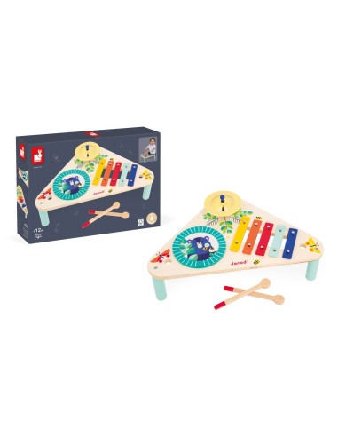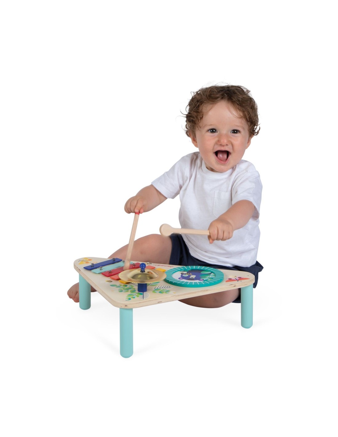Este juguete de estímulo musical es una auténtica orquesta al alcance de la mano, compuesta por 3 instrumentos: un tambor, un platillo y un xilófono metálico de cinco tonos. Cada instrumento es una invitación al despertar musical, que sirve a los más pequeños para descubrir el mundo de los sonidos de forma divertida e interactiva. Además, esta mesa musical tiene un espacio integrado para guardar las baquetas y que no se pierdan. Imagínate al niño con los ojos brillando de alegría, sosteniendo las dos baquetas incluidas y explorando los distintos sonidos que puede producir cada instrumento. Cada golpe de tambor, cada repique de platillos, cada nota del xilófono es una nueva aventura musical. En definitiva, esta mesa musical de madera para niños es mucho más que un simple juguete de primera infancia. Es una auténtica invitación a la exploración musical, una puerta abierta a un universo de sonidos y ritmos para el bebé. Enséñale al pequeño todas las bonitas ilustraciones de la mesa de actividades: abejas, mariposas y su nuevo amigo el oso. ¿Todo listo para embarcaros en una aventura musical?