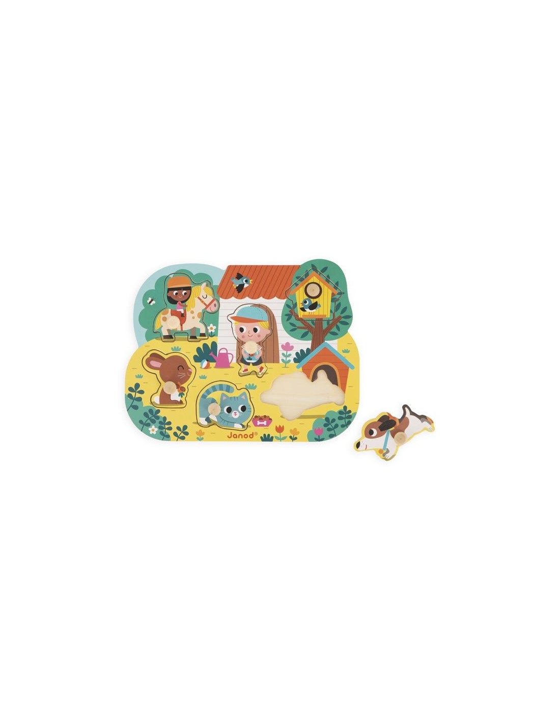 ¡Viva el campo! Su hijo descubrirá en él los animales domésticos con 6 piezas de madera recortadas (Gato, Perro, Caballo con su jinete, Conejo, Pájaro con su casa y Niño con su pez rojo). Puzle de 6 piezas con tacos de agarre de madera con la temática del campo. Los tacos de agarre permiten que los más pequeños puedan manejarlos fácilmente. Desarrolla la motricidad fina. Juguete de estimulación para niños a partir de 18 meses.