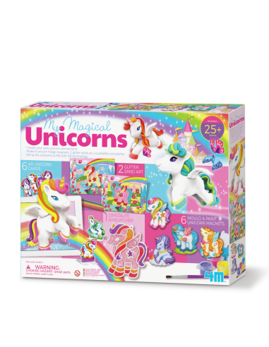 El unicornio es un animal fantástico elegante y, además, es el animal de moda. A los peques les encanta, y es por eso que este kit les va a enamorar ya que podrán realizar diferentes actividades con figuritas de unicornios: crear imanes para la nevera, crear cartas de unicornio, confeccionar marco con una ilustración fantasía o elaborar un cairel de unicornio cristalino ¡este kit asegura horas de entretenimiento y diversión! ¿Tenemos los materiales a punto?Es el juego perfecto para desarrollar sus habilidades motrices, su creatividad y concentración.