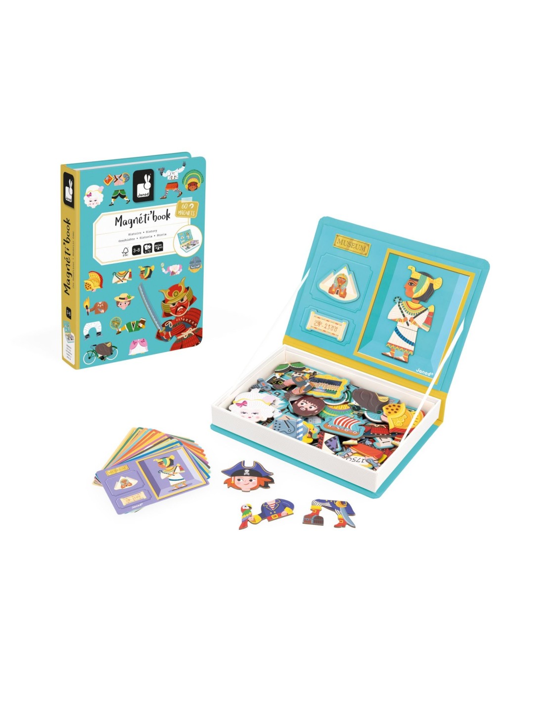 Embárcate en un viaje a través de los tiempos con nuestro Magnéti'book Historia! Los Magnéti'book son unos estuches magnéticos para niños a partir de 3 años. Con 72 elementos, incluidas 12 cartas que representan cada una una época diferente y 60 imanes, este juguete magnético es una puerta abierta a la historia. Cada tarjeta permitirá a los niños explorar un periodo distinto, de modo que descubran los personajes, lugares y objetos que dieron forma a nuestro mundo. Los 60 imanes permiten recrear esas escenas históricas o mezclarlas y combinarlas para crear divertidas historias. Se incluye un folleto explicativo con el contexto histórico de cada época. Los niños podrán profundizar así en sus conocimientos mientras se divierten o imaginarse un personaje fabuloso mezclando épocas: ¿por qué no un CleoPirata? La forma de los imanes se ha pensado para facilitar el desarrollo de la motricidad fina de los niños. Están pensados para que les resulten fáciles de agarrar. Este juguete magnético con forma de libro es ideal para llevárselo a todas partes. Así su imaginación no tendrá límites tampoco cuando crucen la puerta de casa.