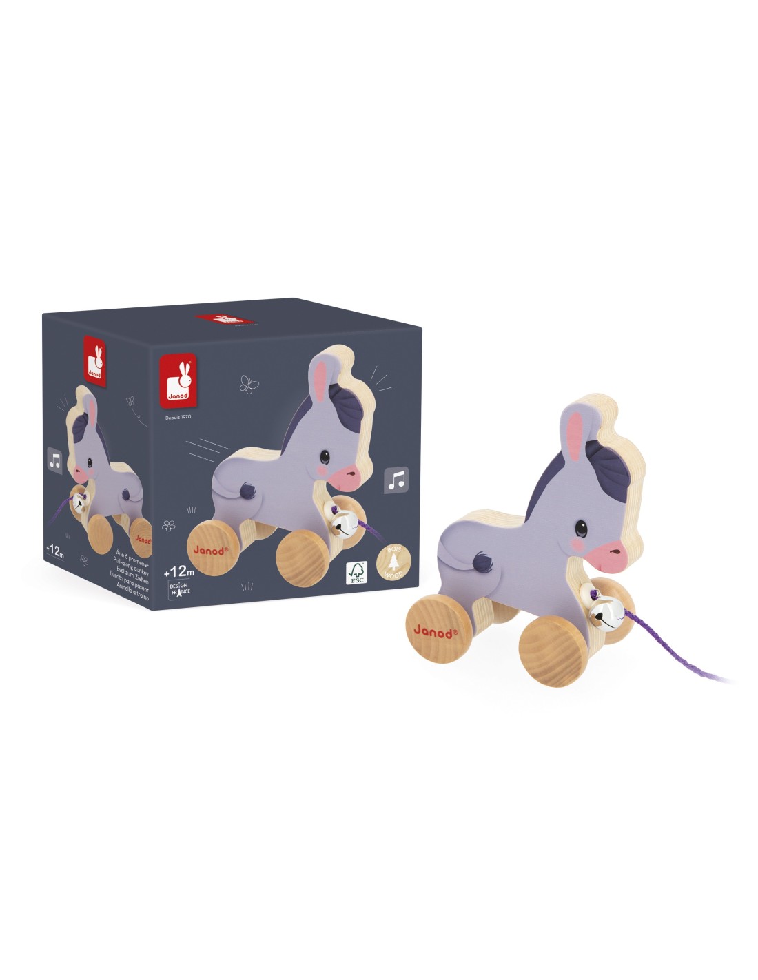Con su pelaje de color claro y sus grandes orejas, ¡este burrito te encantará para pasear a tu bebé! Ideal para los primeros pasos y las grandes aventuras del bebé, es perfecto para los pequeños a partir de 12 meses. Con este juguete de arrastre, el bebé podrá disfrutar de la compañía de sus amigos y desarrollar su imaginación. Es el juguete de aprendizaje precoz perfecto para estimular suavemente la motricidad, e invita a toda la familia a dar un paseo campestre por la granja. Con su bonito cascabel en la parte delantera, este burrito de madera tintinea alegremente mientras rueda. Un burrito suele ser curioso y juguetón, pero también tenaz y paciente... ¿Algo en común con su hijo pequeño, tal vez? En cualquier caso, una cosa es segura: ¡nos vuelve locos, con sus tiernos ojos y sus preciosas ruedas de madera! Del establo a los verdes prados, este juguete andador está esperando a que el bebé salga a pasear.