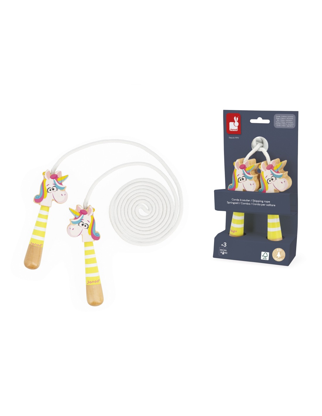 ¡Haz que cada salto sea único con esta comba de unicornio! Con sus mangos decorados con cabezas de unicornios, esta comba encantará a los niños. La longitud de la cuerda es de 2 metros y es ajustable gracias a las cabezas desenroscables. Este producto se puede adaptar perfectamente a cualquier pequeño saltador. Ideal para jugar tanto en interiores como en exteriores para desarrollar la coordinación. Juguete de madera a partir de 3 años.