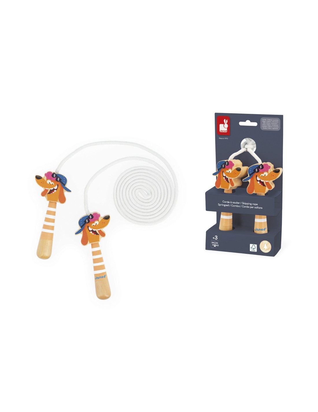 ¡Diviértete moviéndote con esta comba! Con sus mangos decorados con cabezas de perros, esta comba encantará sin duda a los pequeños amantes de los animales. La longitud de la cuerda es de 2 metros y es ajustable gracias a las cabezas desenroscables. Este producto se puede adaptar perfectamente a cualquier pequeño saltador. Ideal para jugar tanto en interiores como en exteriores para desarrollar la coordinación. Juguete de madera a partir de 3 años.
