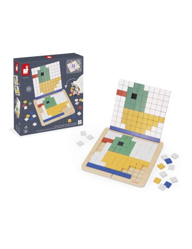 ¡Aparece una rana! Este juego educativo de codificación ofrece 4 formas diferentes de jugar: 1. Superposición: El niño coloca las fichas encima de la tarjeta en el tablero. 2. Reproducción: El niño coloca las fichas en el tablero según la tarjeta. 3. Simetría: El niño reproduce por simetría el dibujo de la media tarjeta. 4. Codificación: Gracias a los números y los colores indicados en la tarjeta, el niño descubre la ilustración oculta. En solitario o en dúo, favorece el desarrollo de la concentración y el conocimiento de los números. Está compuesto por un tablero de madera, 200 fichas de madera y 10 tarjetas modelo. Incluye una bolsa de almacenamiento. Juego educativo de madera y cartón para niños a partir de 5 años.