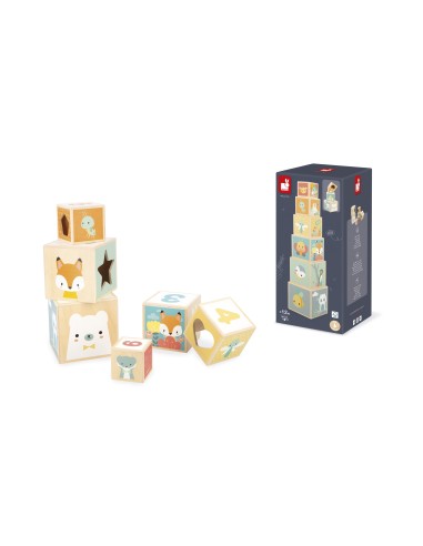 ¡Una pirámide de simpáticos animales! Con este juego de 6 bloques de madera, el bebé podrá desarrollar su motricidad fina y su coordinación, así como su sentido de la observación. ¡Todo es cuestión de descubrir! El bebé apila los cubos del más grande al más pequeño para formar una bonita torre, o los encaja todos en el más grande por tamaño. Cada cubo de madera tiene 5 caras ilustradas o perforadas, con: 1 animal delante, 1 animal en su entorno, 1 animalito sobre fondo de color, 1 número y 1 forma perforada. Muy prácticas para sujetar los cubos, estas formas revelan las ilustraciones cuando se introducen 2 cubos: ¡oh, un pequeño gato en un corazón! Con esta pirámide de cubos, el bebé puede construir sus primeras estructuras. Con 1 año, necesita manipular para entender cómo funciona su entorno. ¡Y qué divertido es dar la vuelta a los cubos! Le encantarán los colores suaves y las dulces ilustraciones de este juego de apilar. De nuestra colección