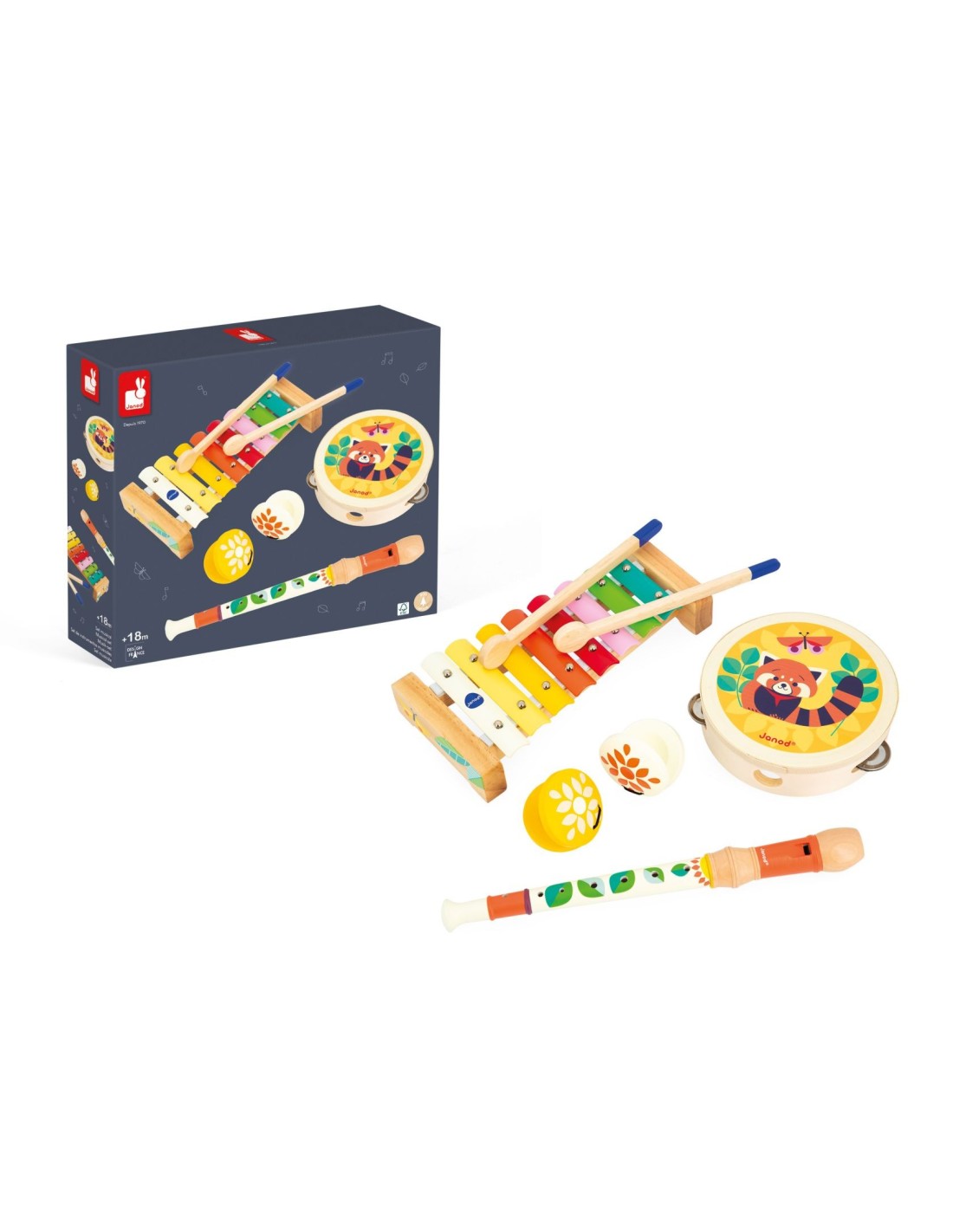 ¡Un set ideal para iniciarse en el maravilloso mundo de la música! Este conjunto de instrumentos musicales de juguete incluye: 1 xilófono de madera y metal de 8 tonos con 2 baquetas, 1 pandereta con preciosas ilustraciones, 1 flauta de madera de colores y 2 castañuelas muy alegres. Cada uno emite un sonido diferente y se manipula de una forma concreta.