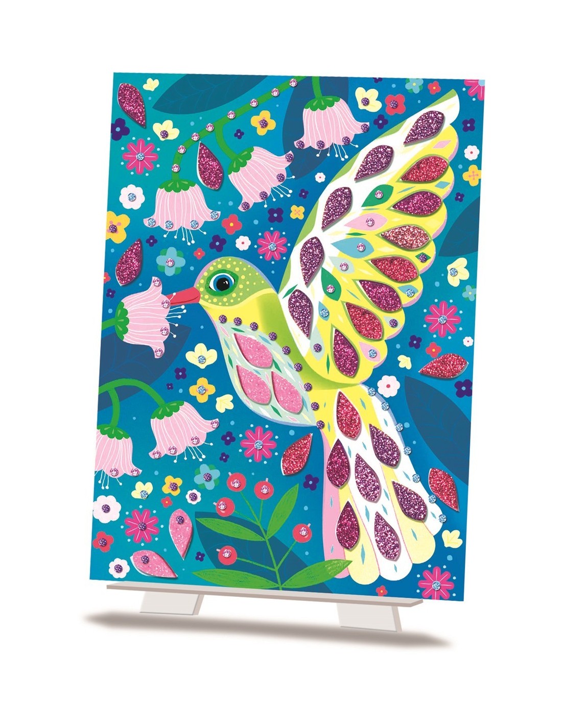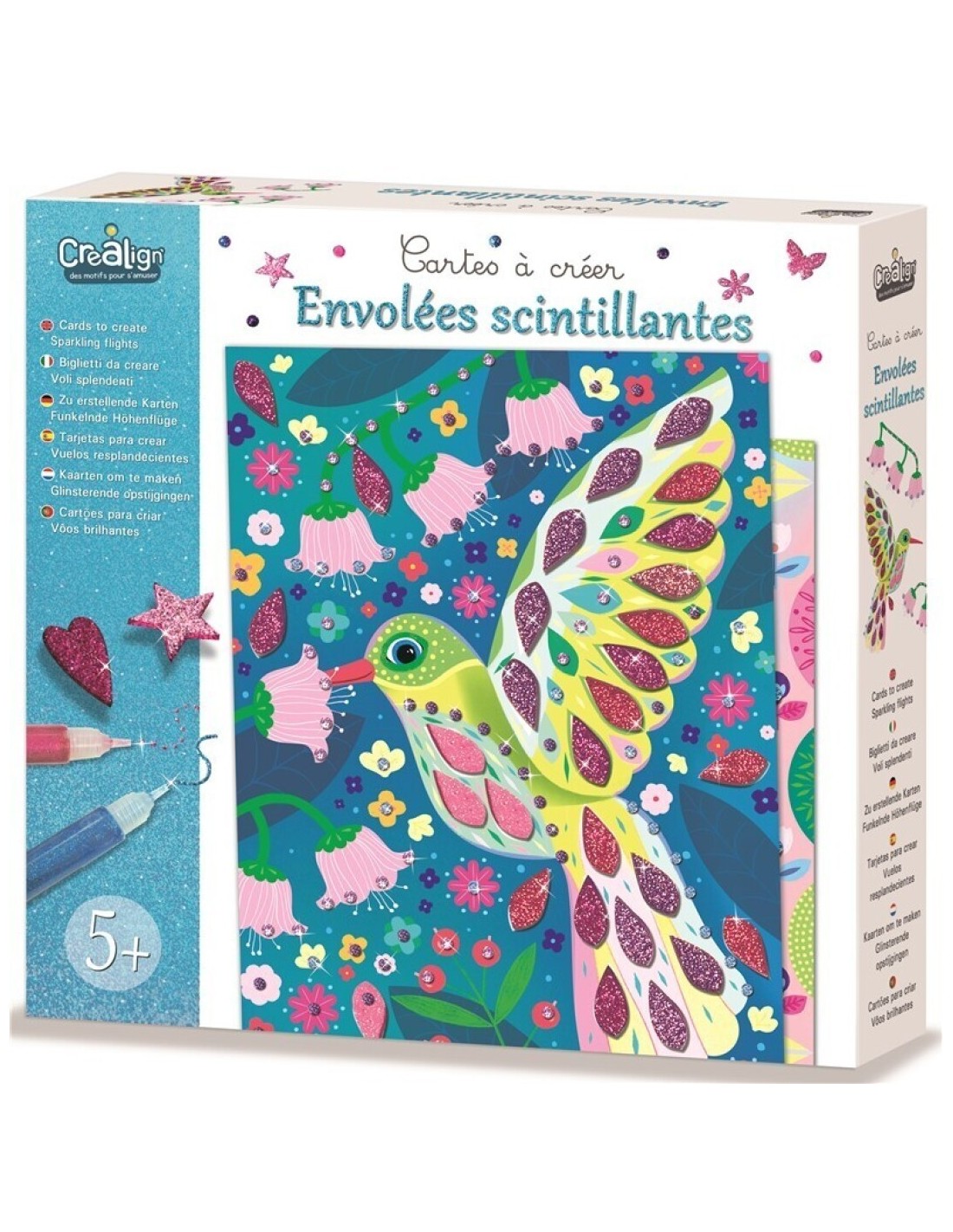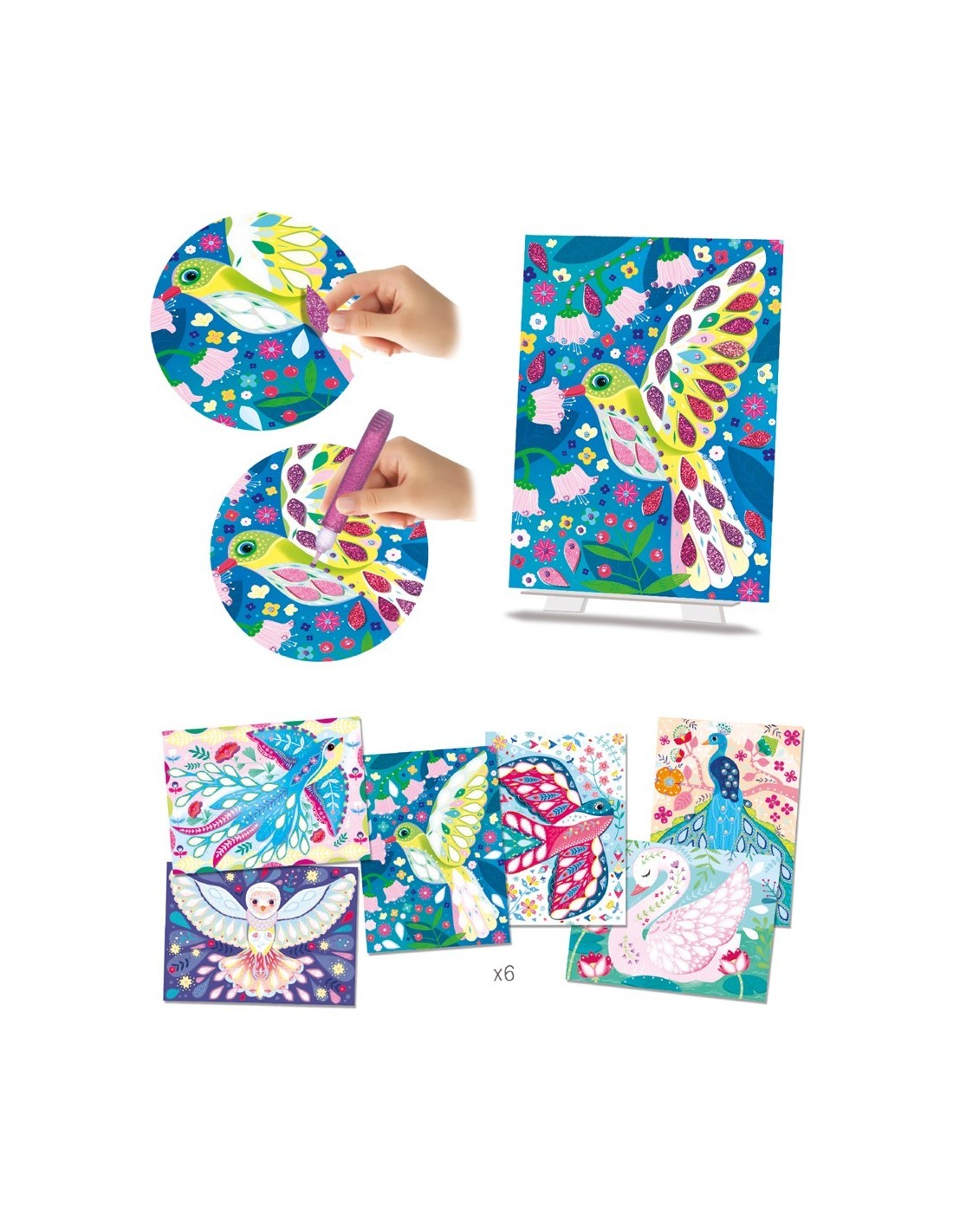 Para todos los amantes de las aves! (pavo real, búho, colibrí, cisne, golondrina y paloma) Los niños pueden adornar y hacer que las tarjetas brillen usando formas brillantes y marcadores de tinta brillante. Luego podrán exhibir sus tarjetas usando el caballete provisto. Gracias a este kit el niño podrá desarrollar su creatividad y destreza. El niño despegará las formas adhesivas brillantes precortadas y las colocará sobre las tarjetas. Luego usará los rotuladores con tinta brillante para finalizar su composición. Contiene: 3 bolígrafos de tinta brillante, 5 hojas con formas brillantes, 6 tarjetas y 1 folleto ilustrado