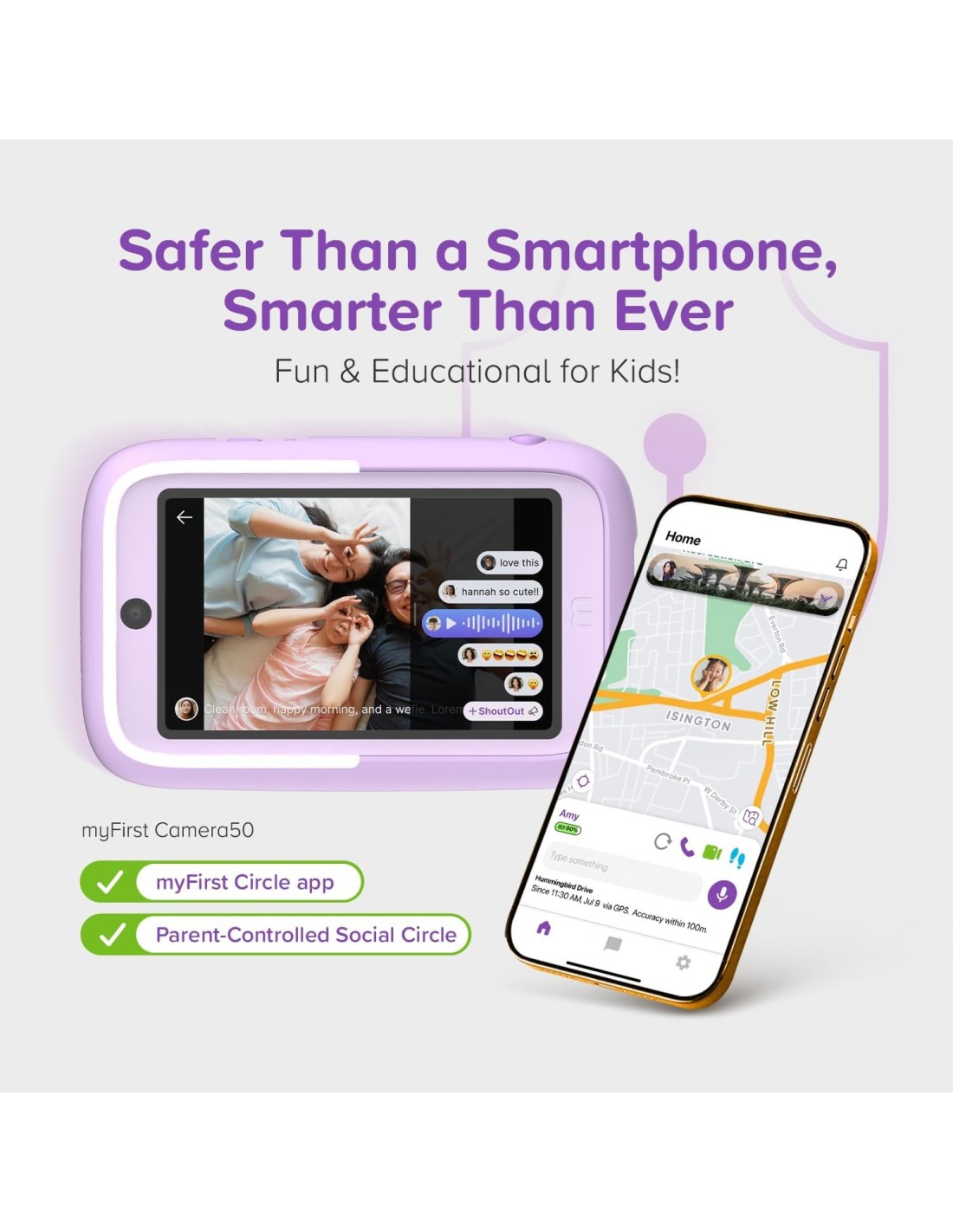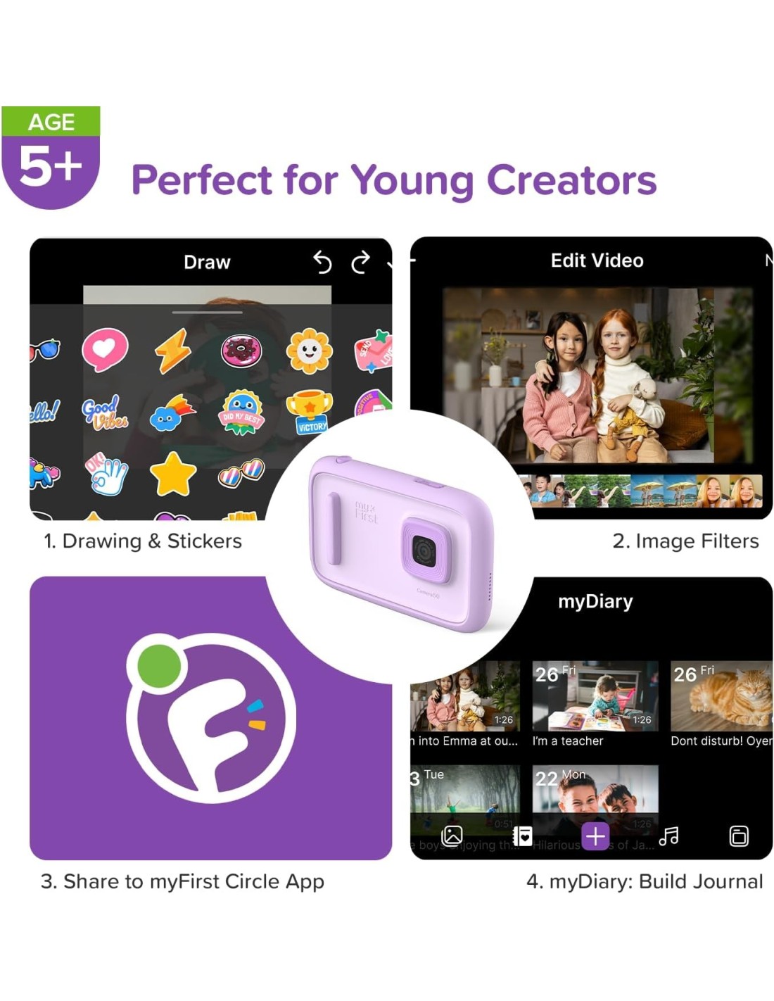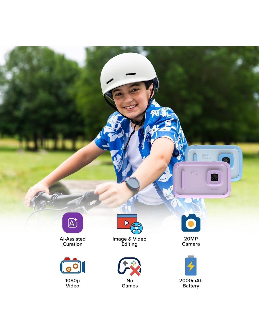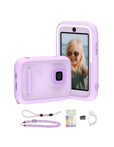 ¡myFirst Camera 50 es la nueva revolución de myFirst! Se trata de una cámara digital para niños con cámara selfie (20MP / 16MP) y grabadora de video FullHD. A parte de su innovador diseño, incorpora funciones extra como reproductor mp3, mp4, plantillas para tus videos y, lo más interesante, edición con IA: selecciona tus videos y clips y la cámara hará un video recopilación que podrás guardar en myDiary.