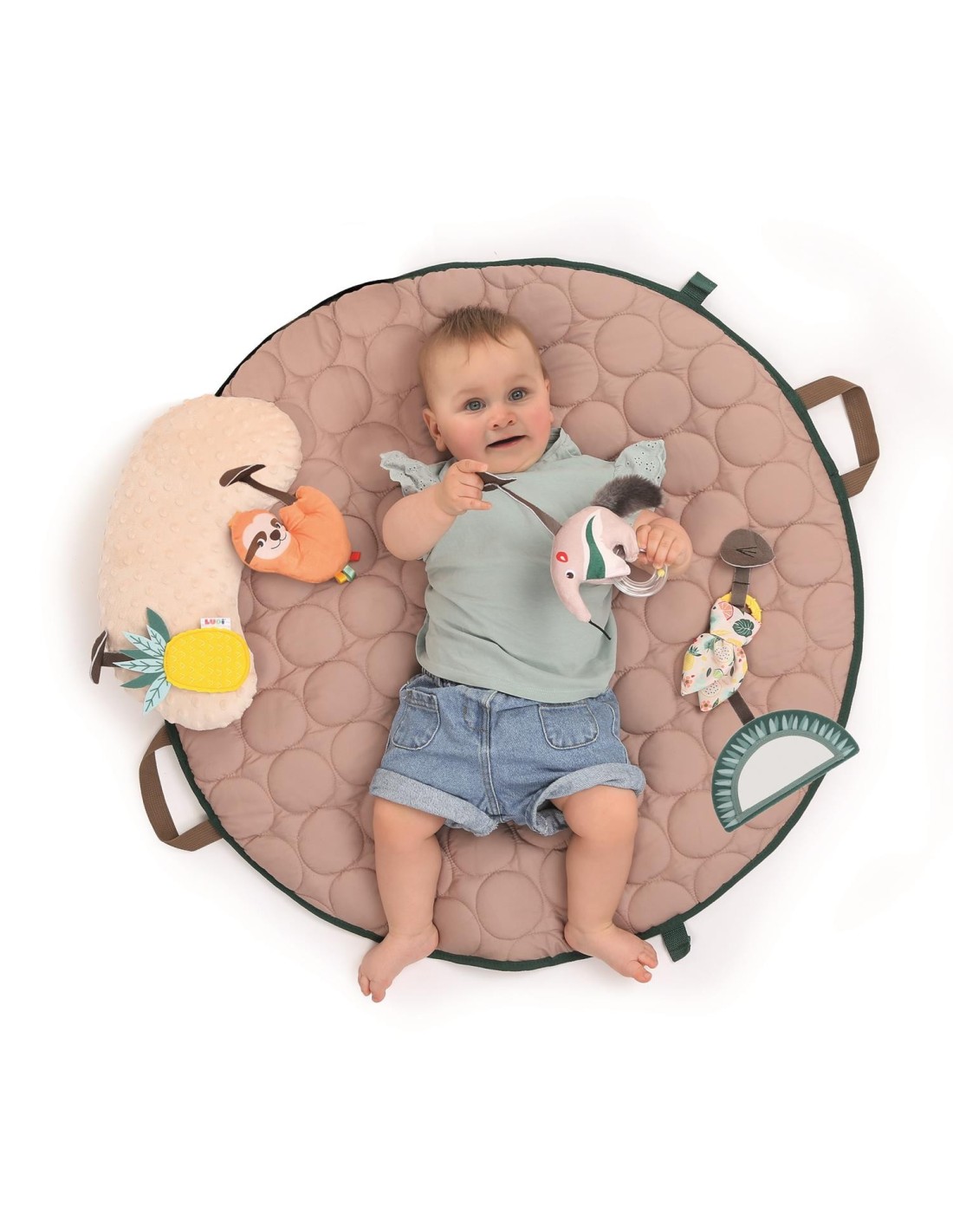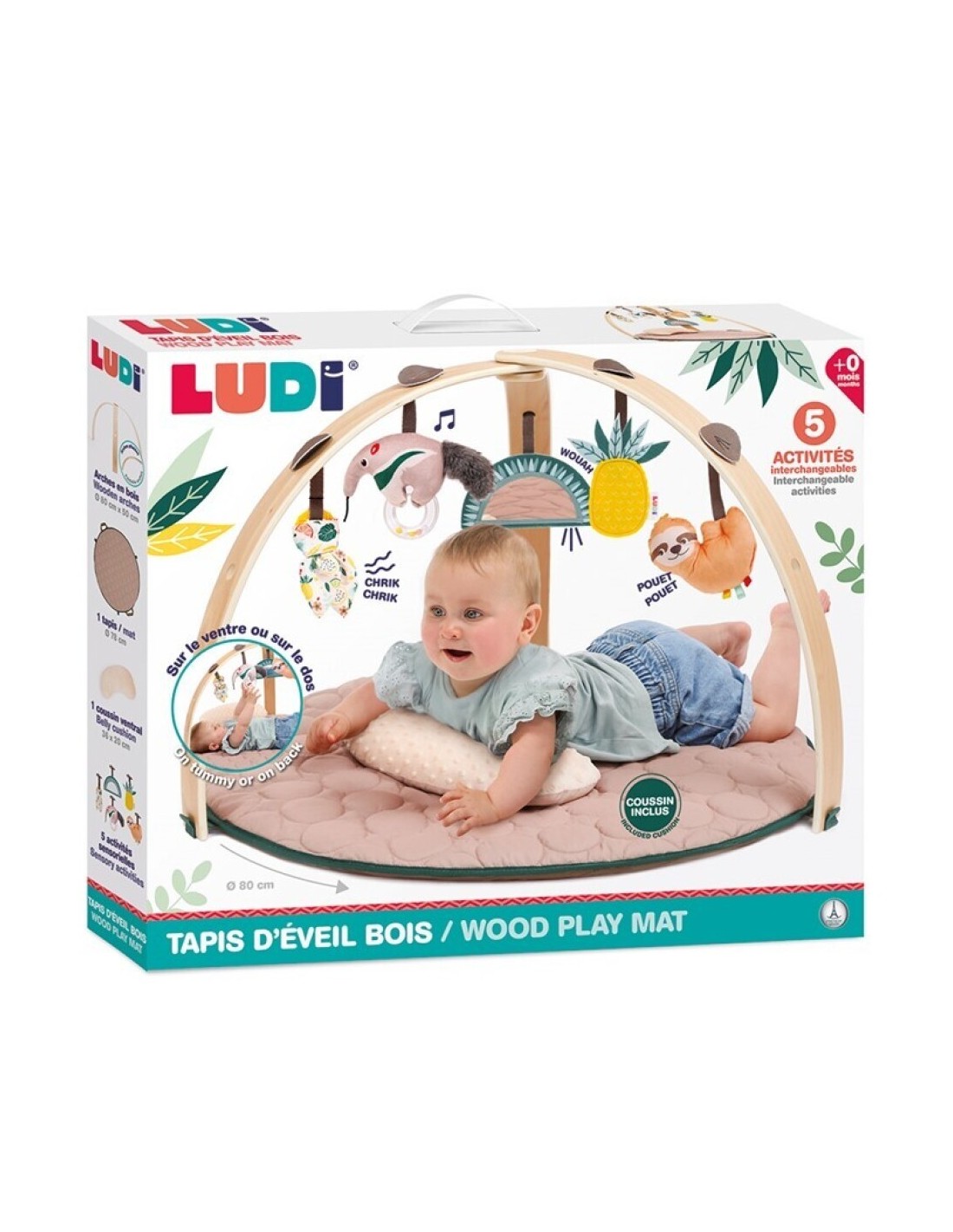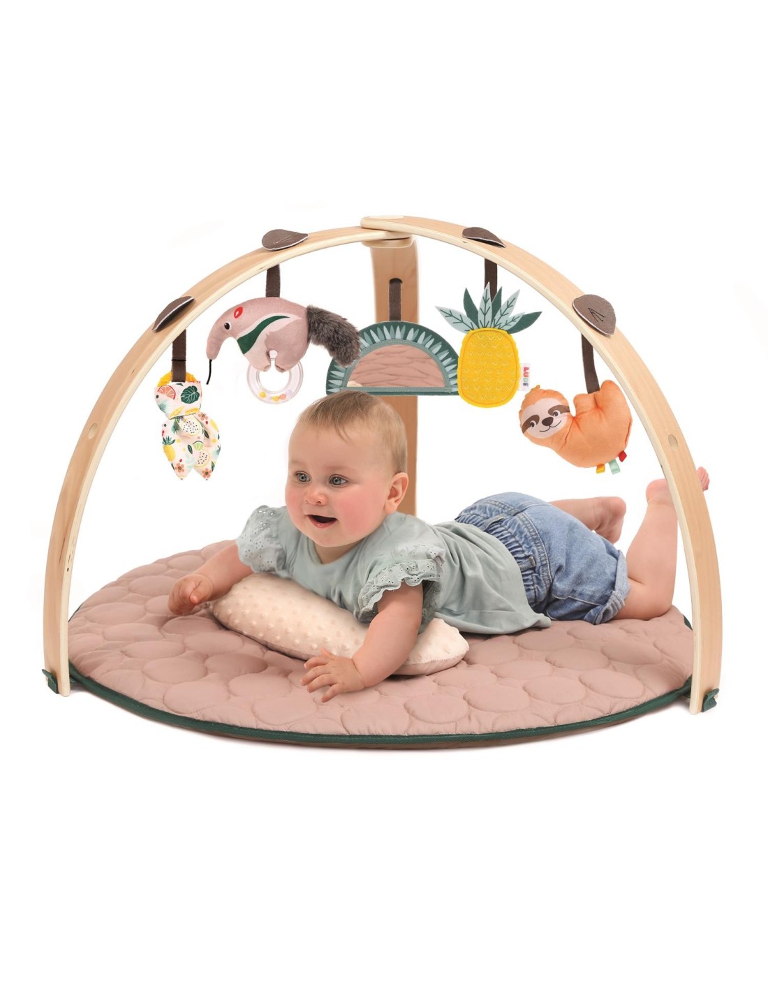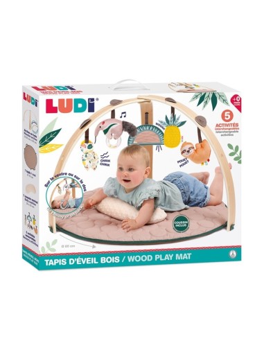 ¡Una alfombra elegante y suave! Ofrécele a tu bebé un espacio de juego y descubrimiento acogedor y estimulante con nuestra alfombra de juego. Su diseño elegante y atemporal con sus arcos de madera se adapta armoniosamente a cualquier dormitorio infantil. Su estructura modular y de fácil montaje permite adaptarse a las diferentes etapas del desarrollo de tu bebé: Desde el nacimiento, el bebé se tumba cómodamente sobre la colchoneta y explora las diferentes actividades suspendidas. Gracias a los 9 puntos de fijación, las 5 actividades sensoriales son intercambiables y permiten al bebé descubrirlas desde un nuevo ángulo. Estos adorables juguetes colgantes estimulan la vista y la capacidad de agarre de tu pequeño. A partir de los 6 meses, el bebé comienza a darse la vuelta y a gatear. La manta de juego se convierte entonces en un espacio de juego propicio para la motricidad libre. Gracias al suave cojín abdominal, se instala cómodamente para descubrir las pequeñas actividades desmontables