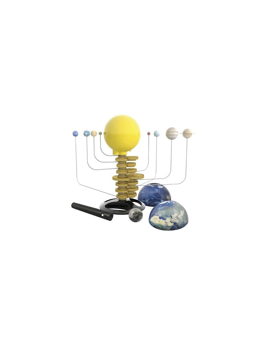 Con este set, los amantes de la astronomía podrán descubrir el sistema solar y sus 8 planetas que giran observando los ciclos de revoluciones pertinentes de una duración total de 35 minutos. El Sol situado en el centro se ilumina a modo de lámpara de noche. Es ideal ya que podrán transformar su modelo colocando la Tierra y la Luna en posición para crear eclipses gracias a la lámpara que se incluye. Edad: A partir de 8 años. Características: - Funciona con 5 pilas de tipo LR03 (AAA), no incluidas - Folleto ilustrado de colores. - Idiomas: francés, español, inglés, holandés, alemán e italiano Dimensiones:
