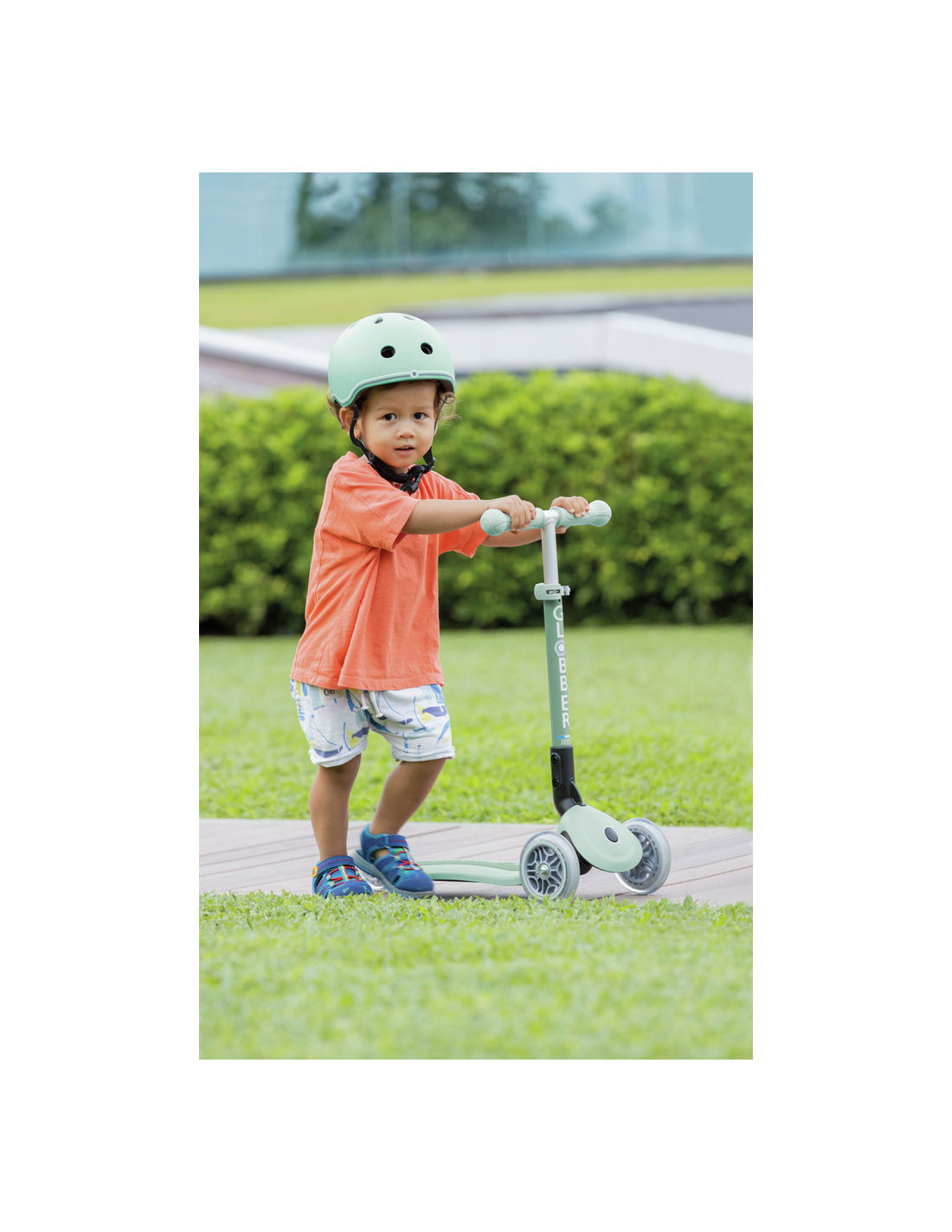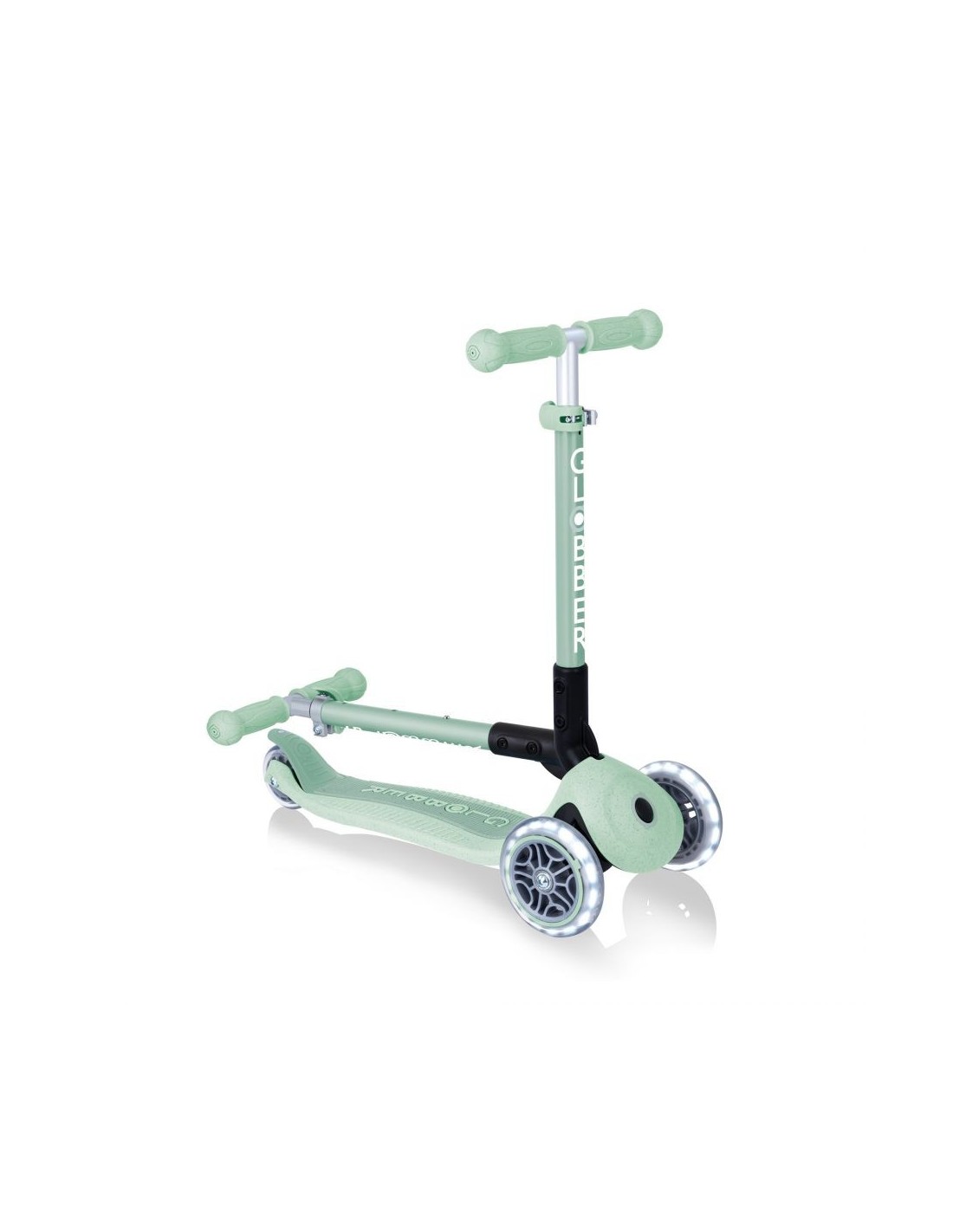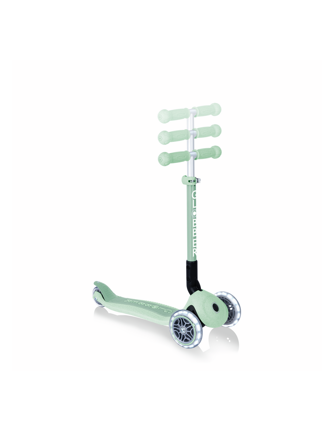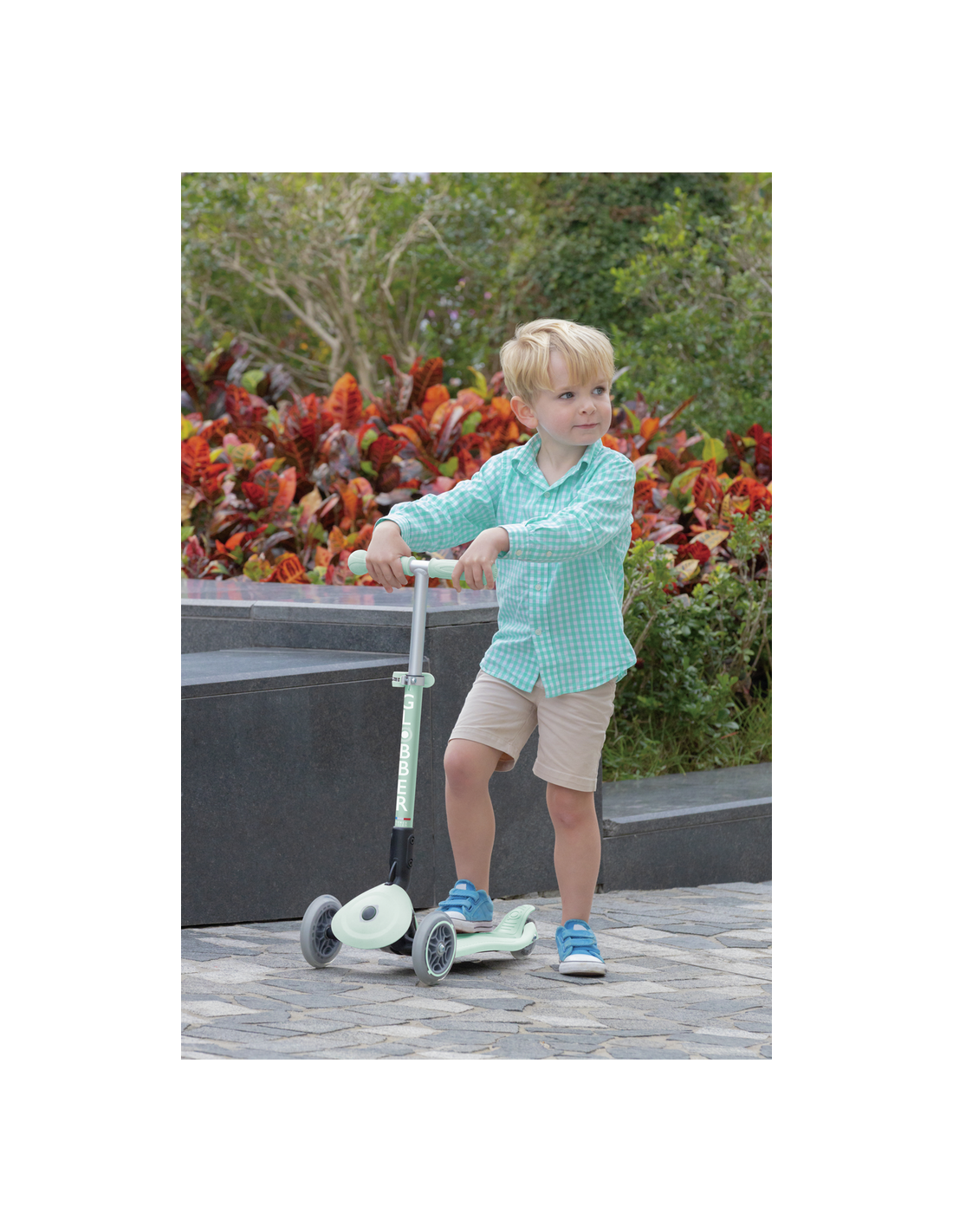 - Sistema de plegado patentado con un botón seguro que pliega el scooter ecológico para niños pequeños en modo trolley. Llévelo cómodamente, hágalo rodar o guárdelo después de jugar.