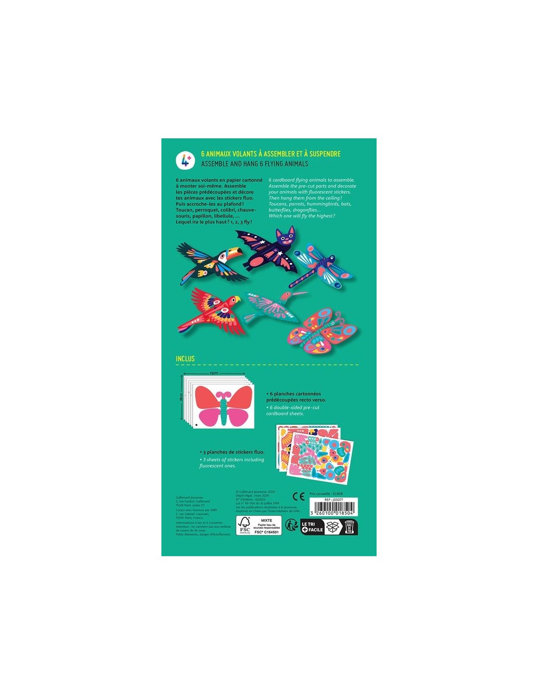 Esta actividad incluye todo lo necesario para montar y colgar 6 animales voladores de cartón.