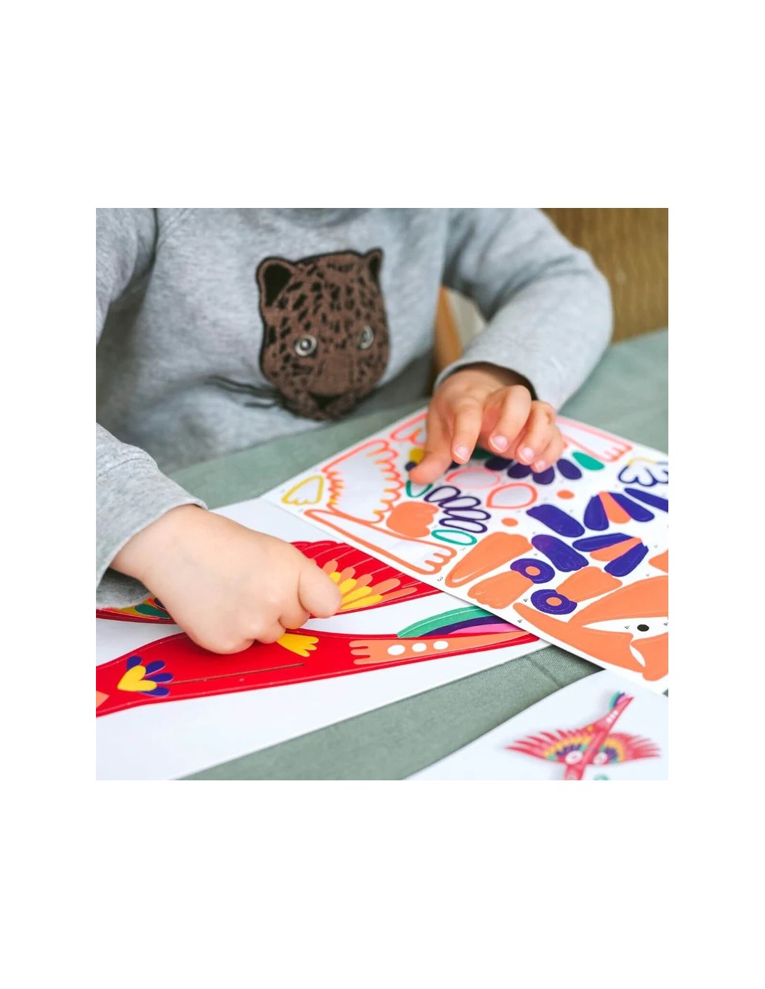 Ensambla las piezas precortadas y decora los animales con las las pegatinas fluorescentes. ¡Después puedes colgarlos del techo!