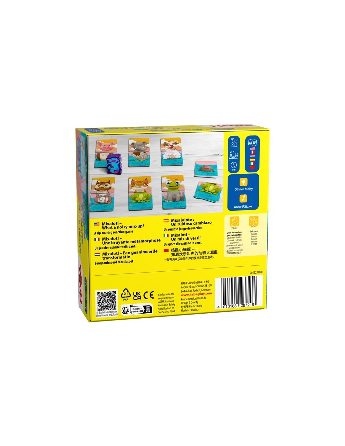 VERSIÓN INTERNACIONAL. Divertido juego de observación y reacción en el que todos los jugadores/as juegan al mismo tiempo. Se colocan sobre la mesa 10 combinaciones de cuerpo y cabeza de distintos animales, y una pila de cartas boca abajo. Al darle la vuelta a la primera carta hay que ser el más rápido en encontrar el mismo cuerpo o cabeza entre las cartas descubiertos y realizar el sonido de la cabeza o cuerpo al que está unido. Quien primero acierte se lleva la carta. Al final gana quien haya reunido el mayor número de fichas de animales.
