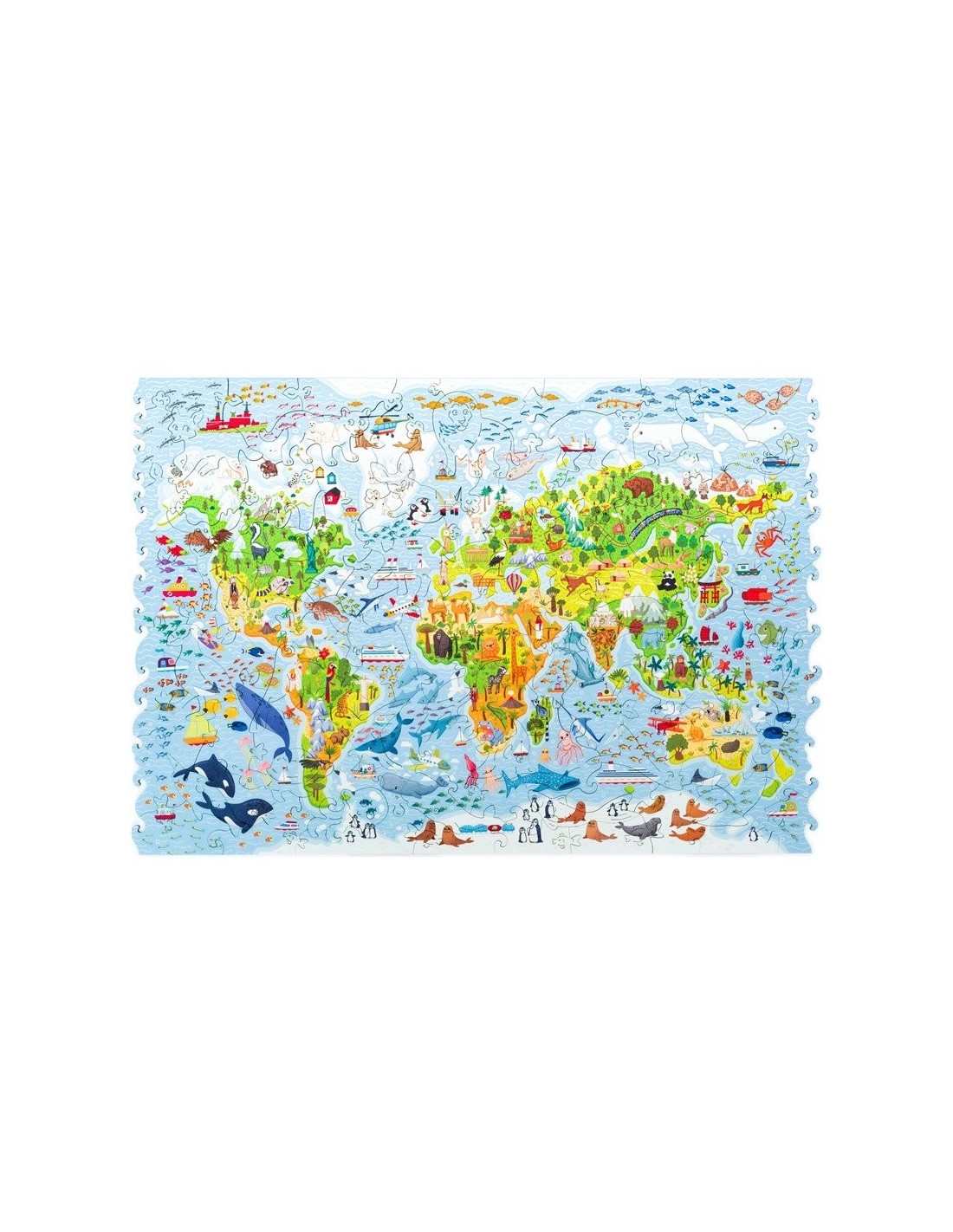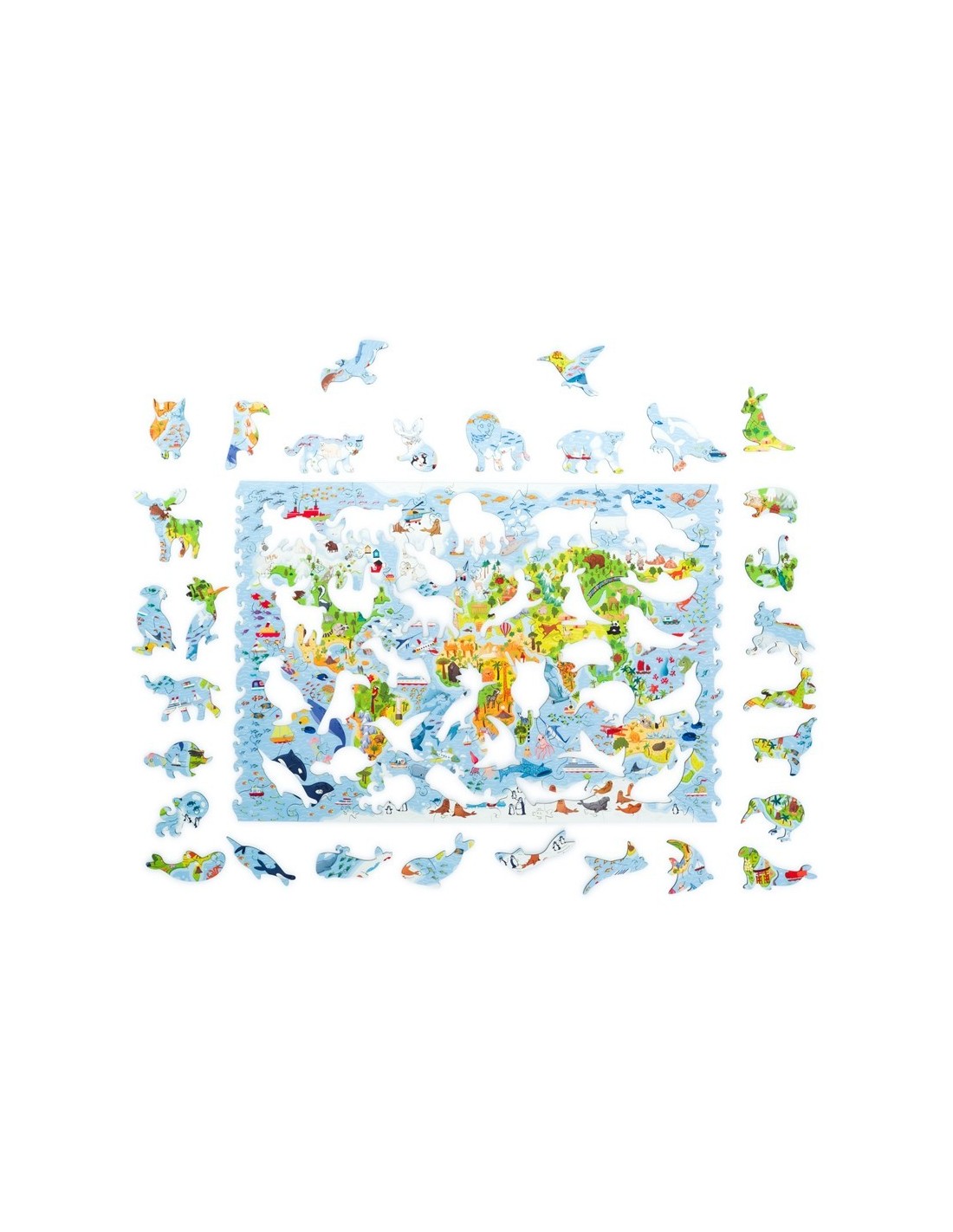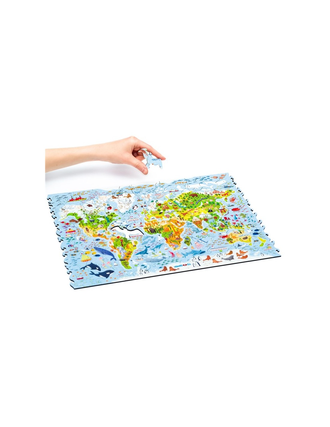 ¡Hay tantas cosas y criaturas interesantes dentro de nuestro puzzle mapamundi para niños! Animales exóticos, habitantes del océano y aves, diferentes naciones y monumentos arquitectónicos, varios vehículos, desde trenes hasta veleros.