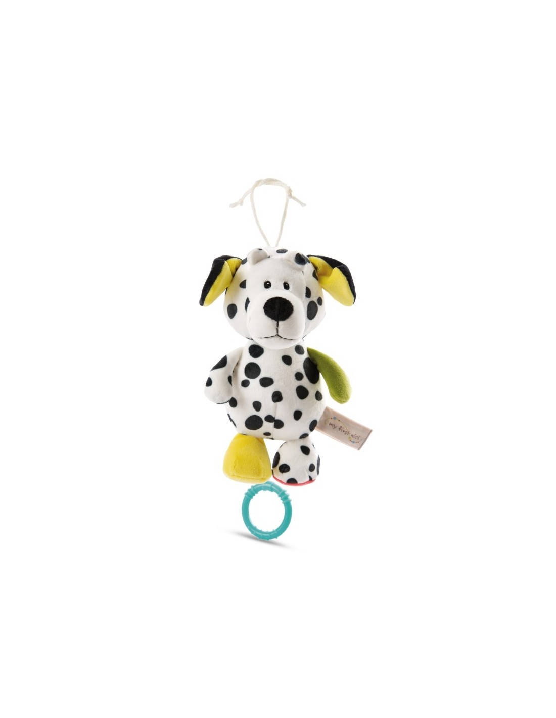 La caja de música de cuerda de 18 cm, hecha de peluche con forma de un divertido dálmata de lunares, con orejas amarillas brillantes y brazos y piernas de diferentes colores, es el regalo perfecto para la llegada de un bebé o un bautizo. El perro impresiona con su suave cuerpo de peluche y su sencillo mecanismo de cuerda. La caja de música integrada acompaña al bebé a un mundo de ensueño con la canción de cuna de Brahms. Gracias a dos cintas, el peluche y la caja de música se pueden fijar fácilmente a la cama, el cochecito o la sillita de coche. es un excelente ayudante para dormir y, al mismo tiempo, estimula las habilidades motoras y sensoriales de los bebés.