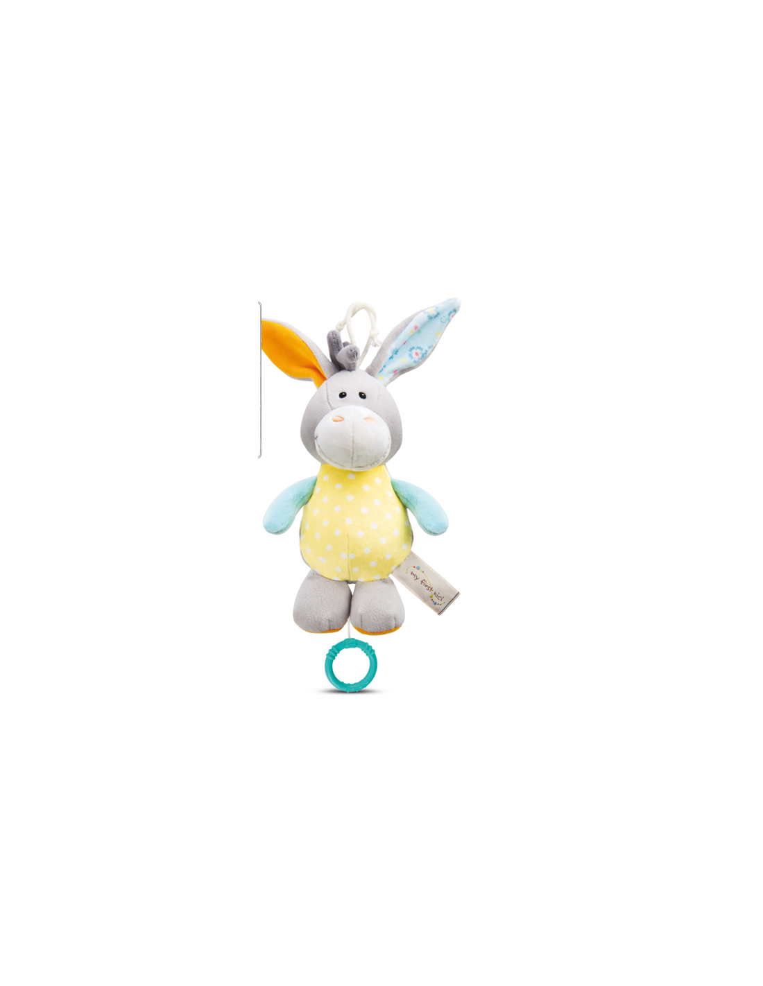 La caja de música de cuerda de 18 cm, hecha de peluche, con forma de un simpático burrito con un pijama de lunares amarillos y blancos, y orejas y brazos de diferentes colores, es el regalo perfecto para la llegada de un bebé o un bautizo. El burrito gris impresiona con su suave cuerpo de peluche y su sencillo mecanismo de cuerda. La caja de música integrada acompaña al bebé a un mundo de ensueño con la canción de cuna de Mozart. Gracias a dos cintas, el peluche y la caja de música se pueden fijar fácilmente a la cama, el cochecito o la sillita de coche. es un excelente ayudante para dormir y, al mismo tiempo, estimula las habilidades motoras y sensoriales de los bebés.