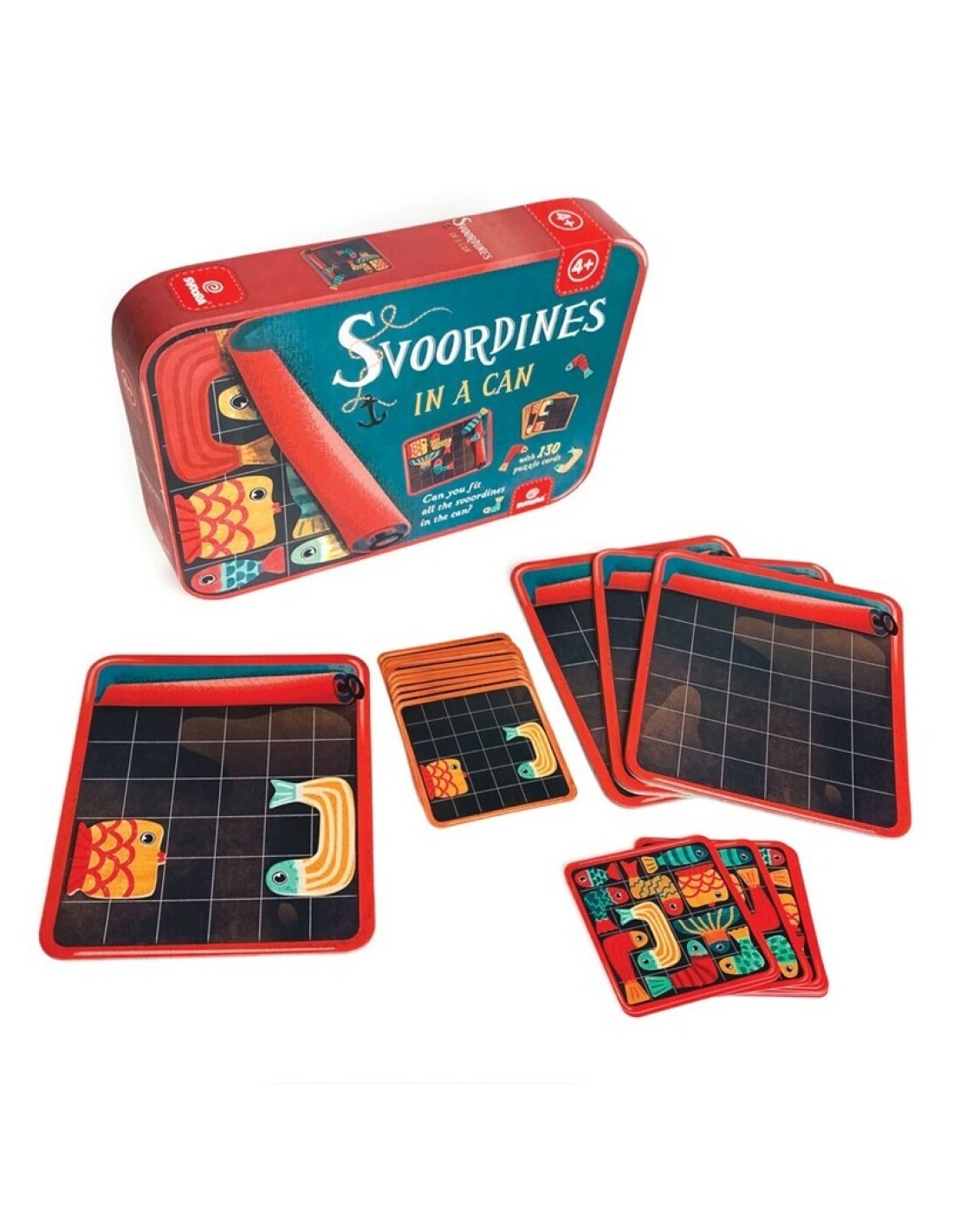 ¿Cabrán todas estas deliciosas y coloridas Svoordines en una lata? Abre una tarjeta e intenta ser el primero en resolver el rompecabezas colocando los elementos representados en la posición correcta en tu tablero y luego llenando los espacios en blanco con el resto. Un juego de rompecabezas para 1 a 4 jugadores que desarrolla la capacidad de resolución de problemas y agudiza la concentración y la percepción espacial. Los tableros y las piezas de Svoordines son magnéticos para una experiencia de juego aún mejor. El juego incluye 4 tableros magnéticos para jugadores, 4 sets magnéticos de Svoordines y 130 tarjetas de rompecabezas con sus soluciones.