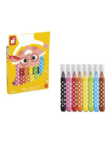 ¡Colorea con total tranquilidad con los rotuladores JUMBO! Este set de 8 rotuladores de gran tamaño es perfecto para los más pequeños, gracias a su punta gruesa especialmente diseñada para grandes superficies para colorear. Para garantizar la seguridad de los niños, la punta está bloqueada firmemente en ambas direcciones, evitando que se hunda o se salga. La tinta se puede lavar fácilmente, lo que permite a los pequeños artistas expresarse sin preocupaciones. Una excelente elección para iniciar a los más pequeños en el placer del dibujo que ofrece, al mismo tiempo, tranquilidad a los padres. Producto para niños a partir de 1 año.