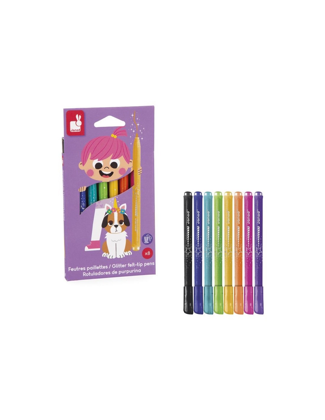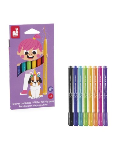 ¡Añada un toque de magia brillante a las creaciones de su hijo con los rotuladores de purpurina! Este set de 8 rotuladores ofrece una alta densidad de purpurina y una paleta de colores brillantes, perfectos para dibujos vibrantes. La tinta se puede lavar fácilmente, lo que permite a los pequeños artistas expresarse sin preocupaciones. La caja de cartón con efecto de purpurina añade un toque de fantasía a cada uso. Una excelente elección para estimular la creatividad de los niños que ofrece, al mismo tiempo, tranquilidad a los padres. Producto para niños a partir de 3 años.