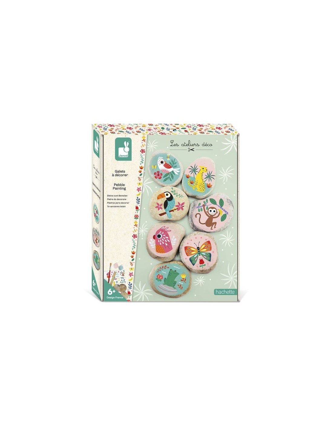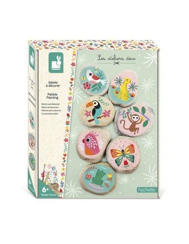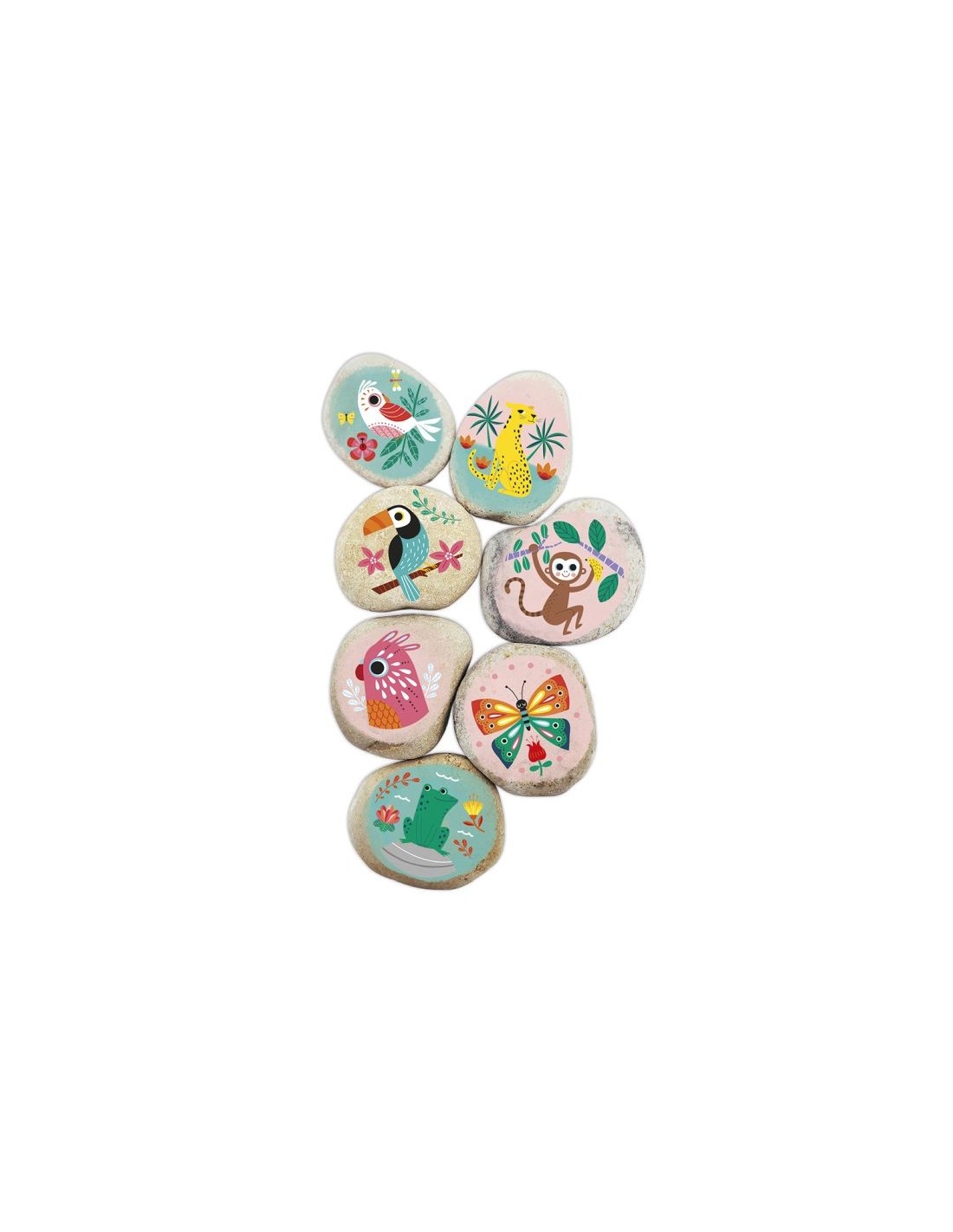 7 piedras, 1 lámina para transfer y 1 palito de madera, 2 botes de pintura, 1 pincel y 1 cuaderno con instrucciones y modelos.