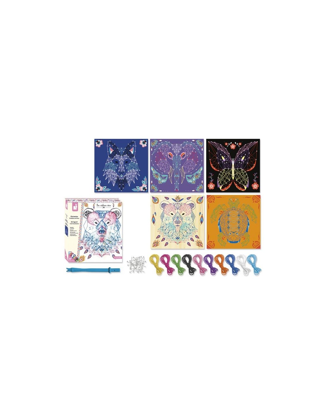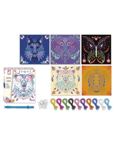 5 cuadros de hilos tensados para llevar a cabo con la ayuda de 10 madejas de hilo de algodón de 7 metros, 800 clavos y una herramienta para clavar los clavos. Incluye un librito de instrucciones con ejemplos.
