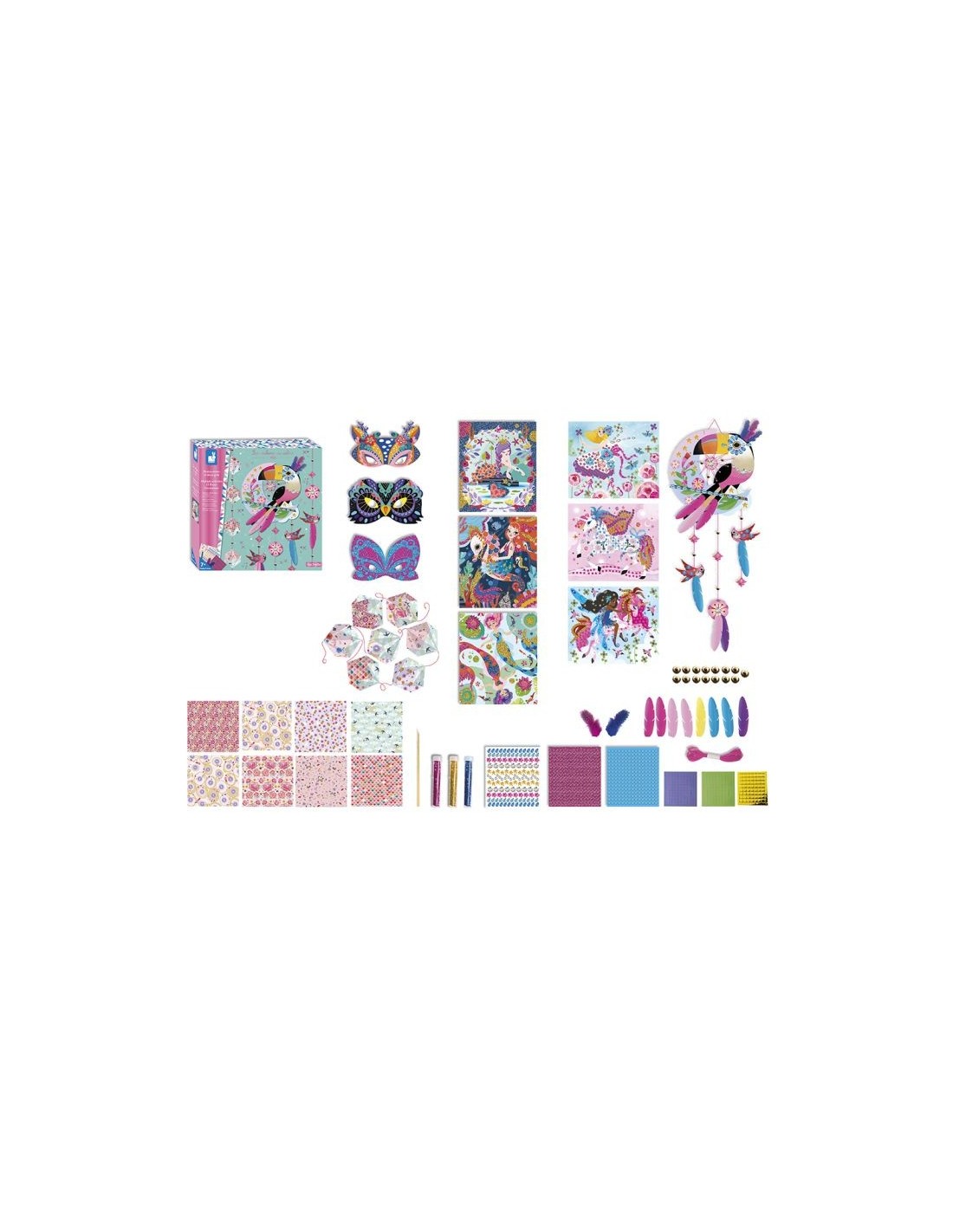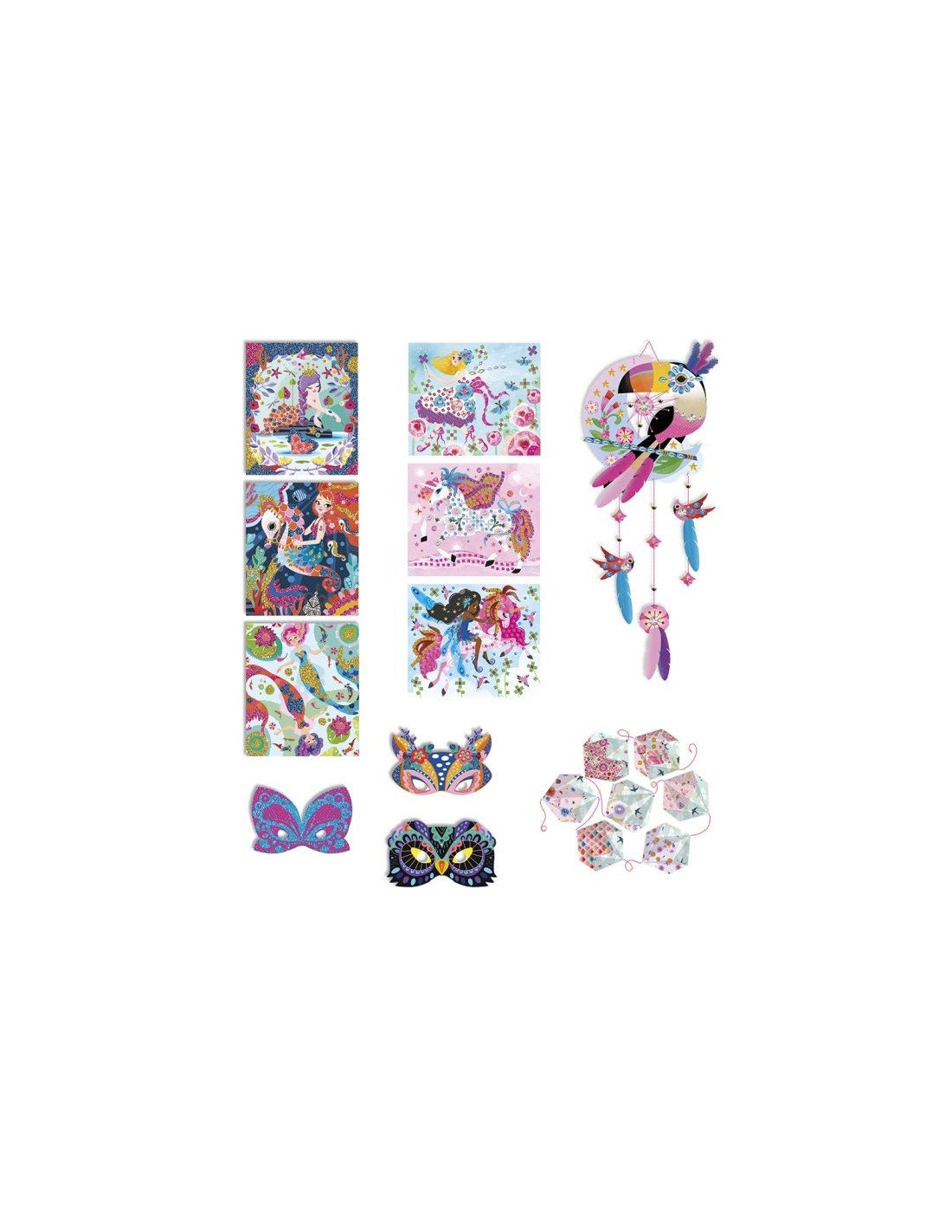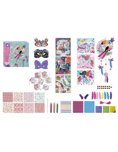 6 cuadros, 3 máscaras para rascar, 1 atrapasueños y 1 guirnalda para crear con 500 mosaicos de goma eva, 3 tubos de purpurina, 1 lámina de estrás, 10 plumas, 15 perlas, 14 hojas de origami e hilo de coser.