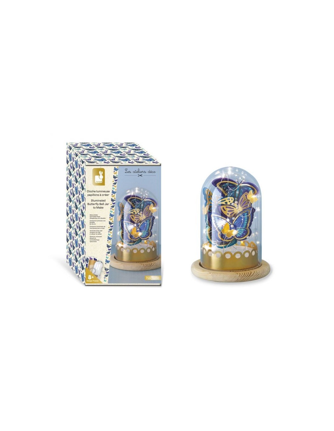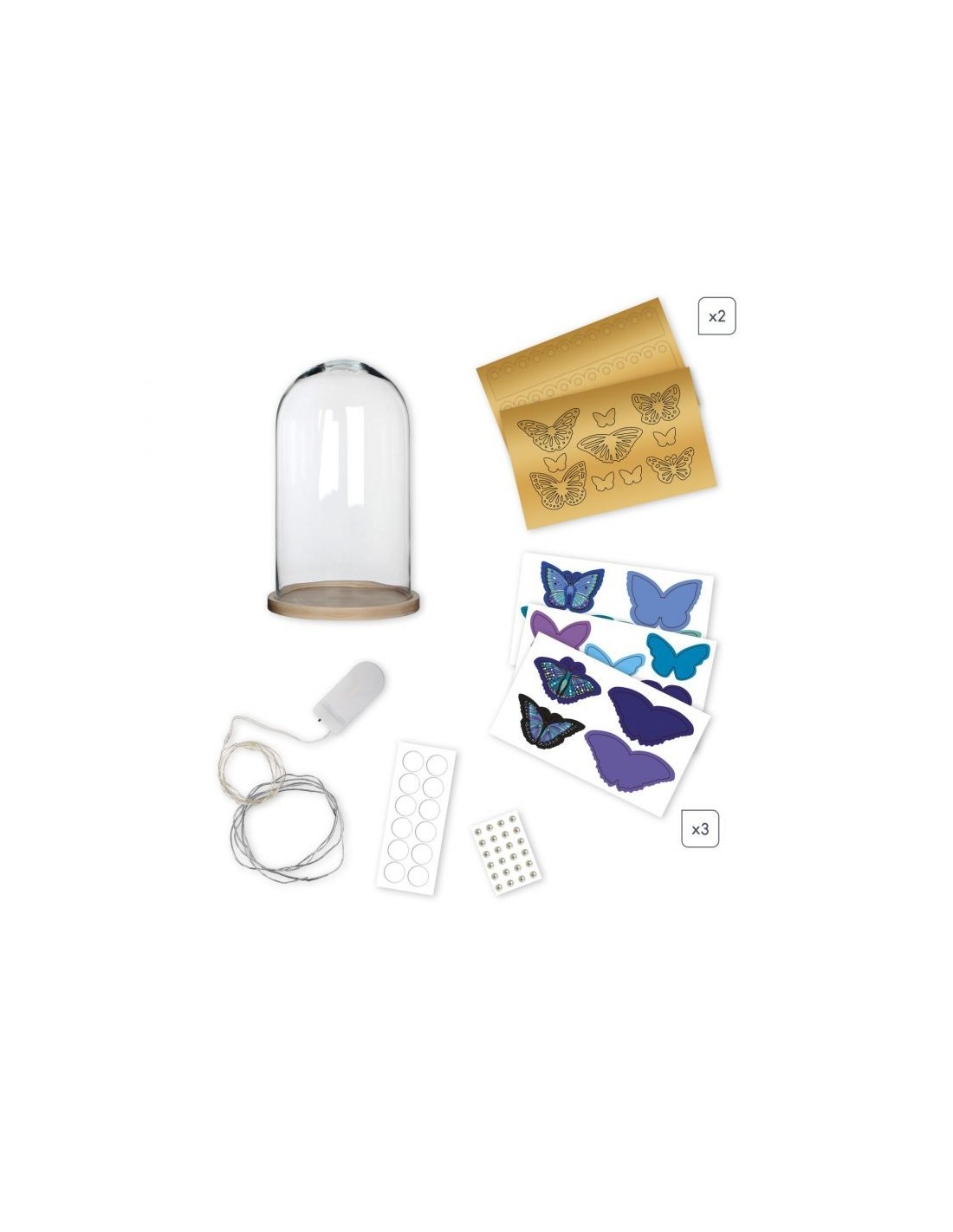 ¡Mariposas doradas listas para salir volando! Esta actividad decorativa se compone de una campana para llenar de mariposas. El estuche contiene una campana de plástico y su soporte de madera, 2 planchas doradas y 3 planchas estampadas precortadas, una plancha de medias cuentas, una base de espuma, un hilo de aluminio flexible, una guirnalda de 10 LEDs y su pila incluida y 1 folleto de instrucciones. Después de haber decorado el zócalo, basta con ensamblar las mariposas y engancharlas en el hilo de aluminio con la ayuda del folleto de instrucciones incluido. Se trata de una actividad original que desarrolla la motricidad fina y la concentración y que requiere aproximadamente 2 horas. Este estuche es adecuado para niños a partir de los 8 años.