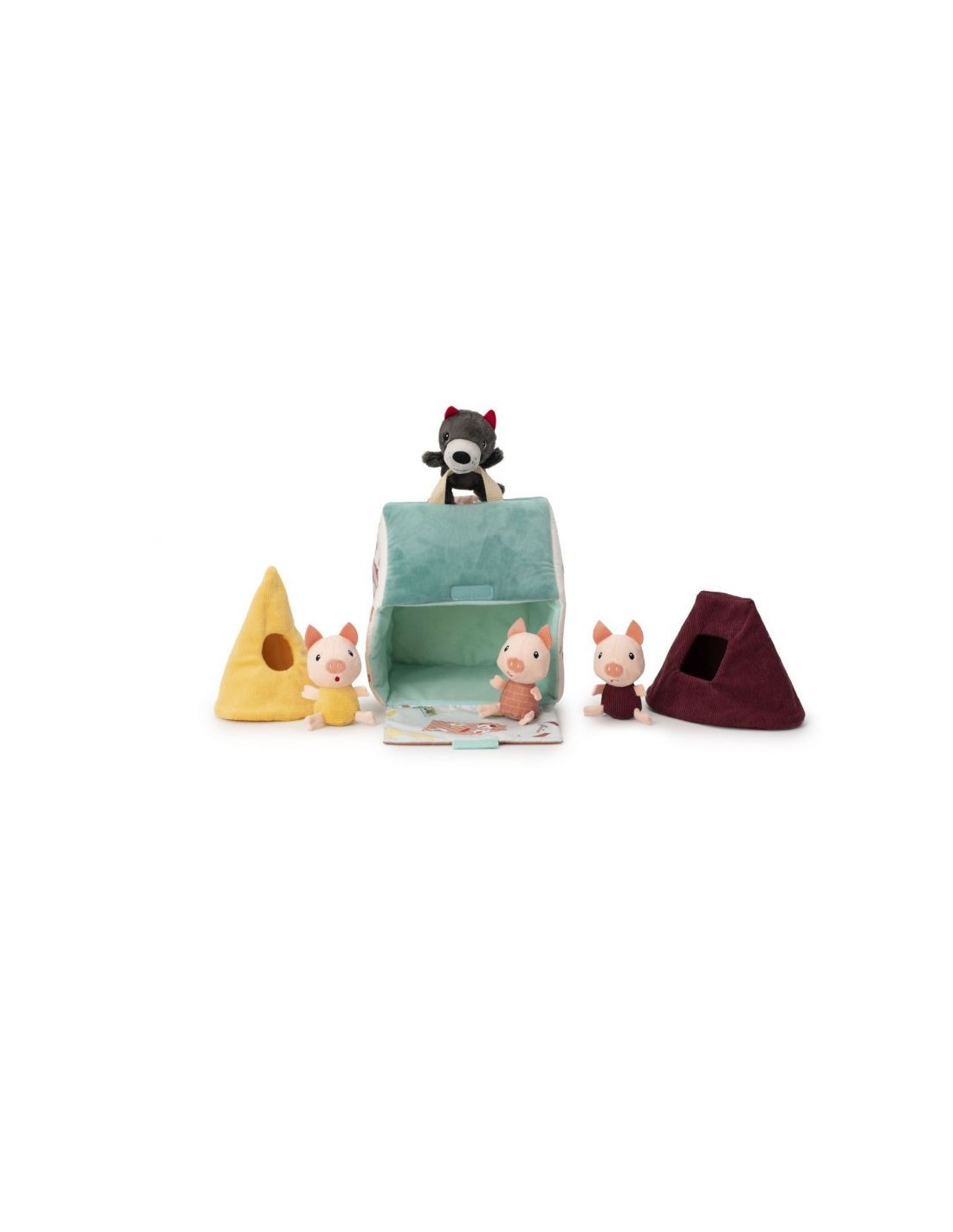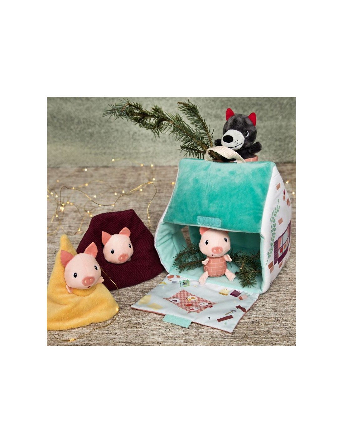Este juguete de tela, inspirado en el cuento del lobo y los tres cerditos, incluye 4 personajes, 2 casitas que representan las casas de paja y madera, y una tercera casa que representa la casa de ladrillos. La casa de ladrillos tiene una chimenea por donde el lobo puede deslizarse, asI como una pared que se abre. Estimulando la imaginaciOn, este juguete fomenta el juego creativo y desarrolla habilidades motoras finas.